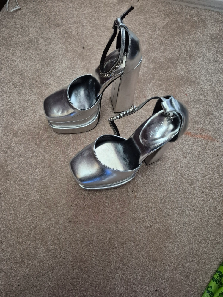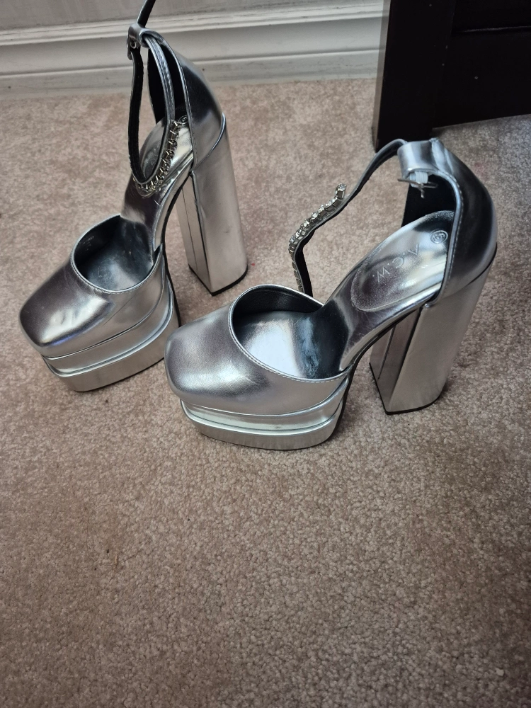 Selling a pair of silver platform heels in size 6. They have a square toe and chunky heel. Perfect for a night out!
