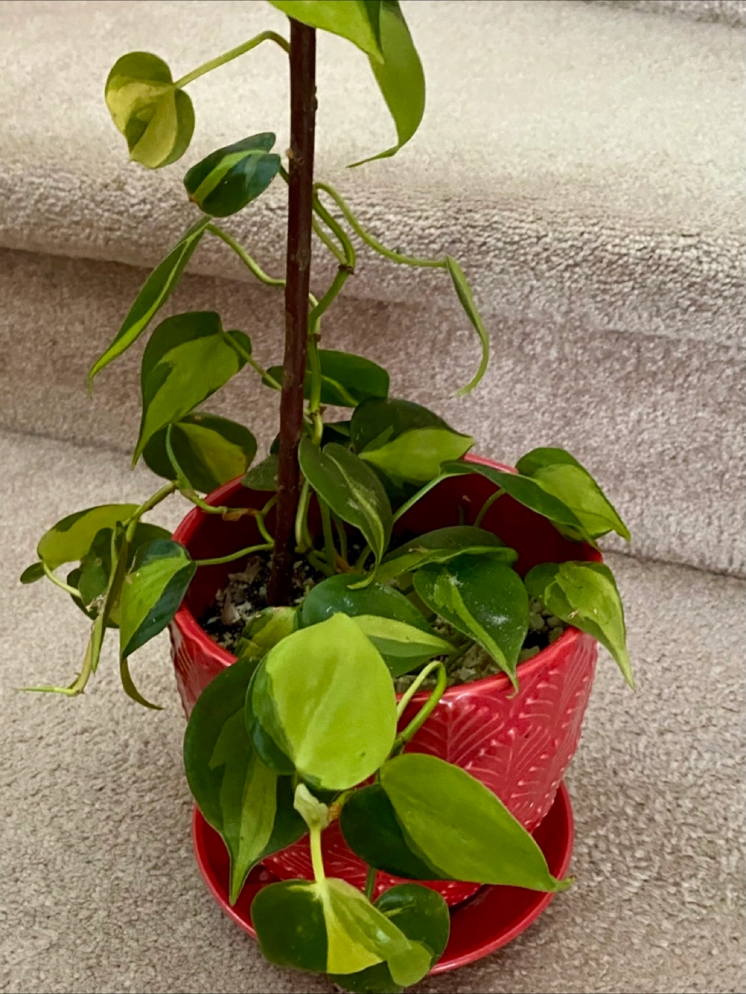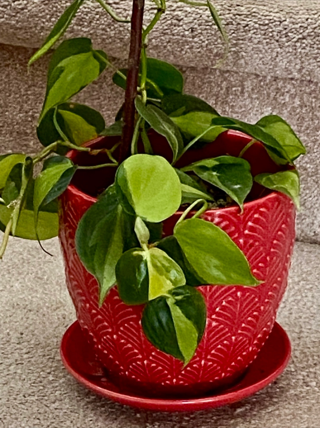 A lovely philodendron plant in a red patterned pot, ready to brighten up your space! It's currently thriving and would make a great addition to any home or office