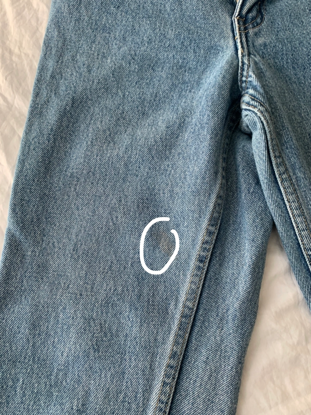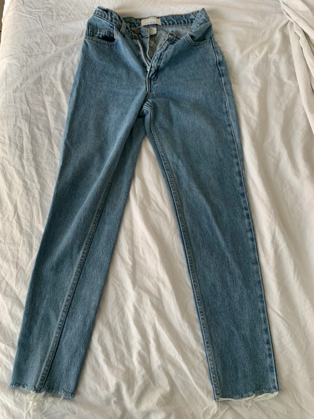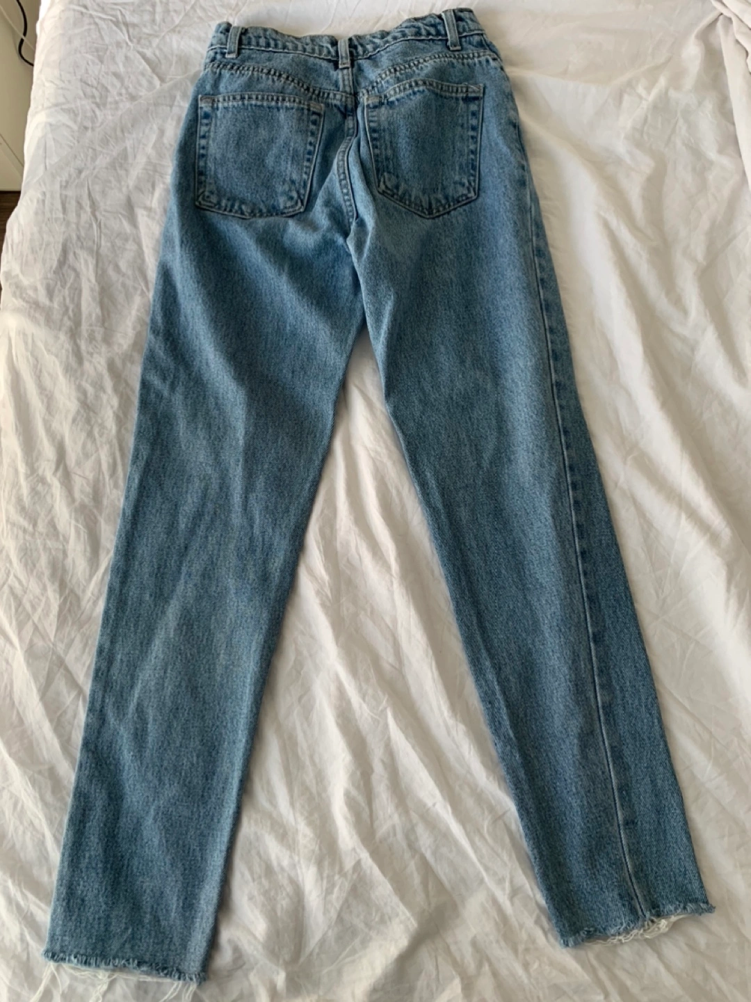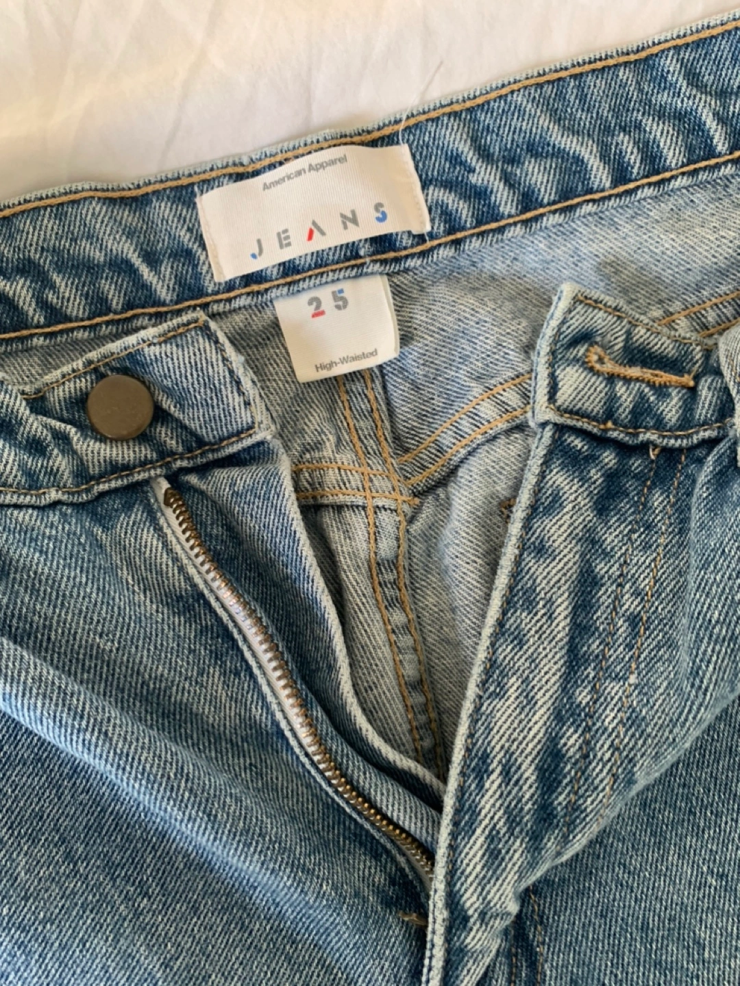 American Apparel high waisted jeans in size 25. Great quality fabric. There is a small mark on the leg, as shown in the picture.
