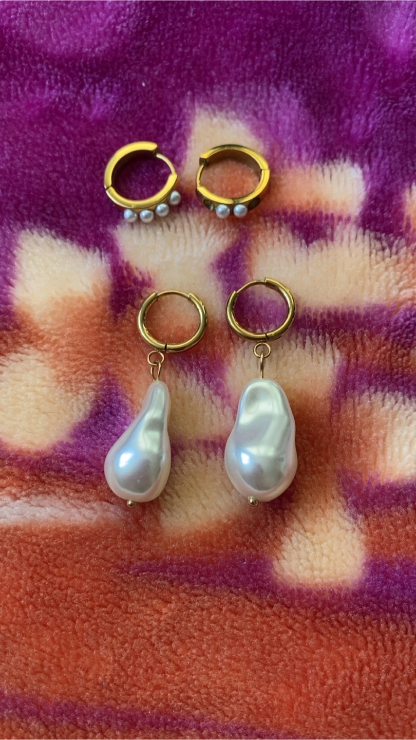 Selling two pairs of earrings! One is a gold tone hoop with small pearls, and the other is a gold tone hoop with a larger, tear-drop shaped pearl. Both are in great condition!