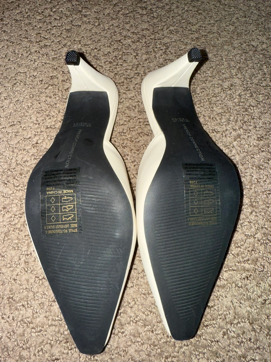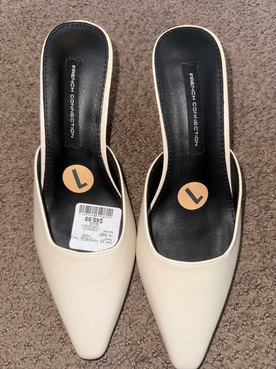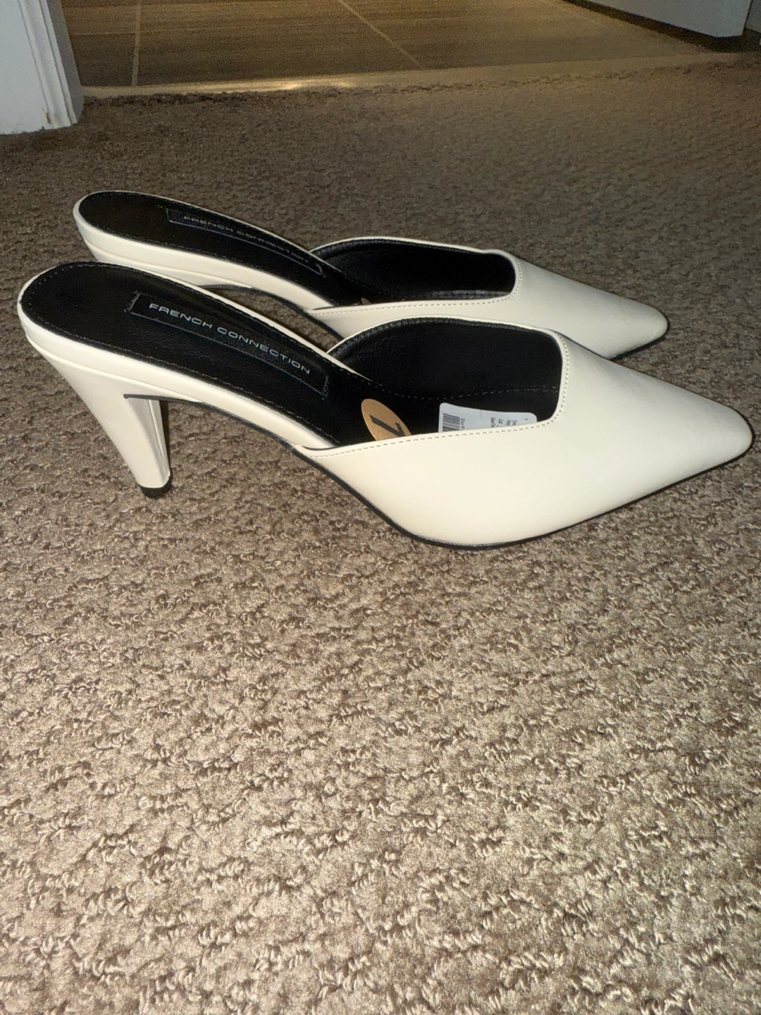 60French Connection white mules in size 7. These stylish mules are perfect for adding a touch of elegance to any outfit. Originally bought for $49.99, these are in great condition and ready for a new home. They have not been worn outside yet.