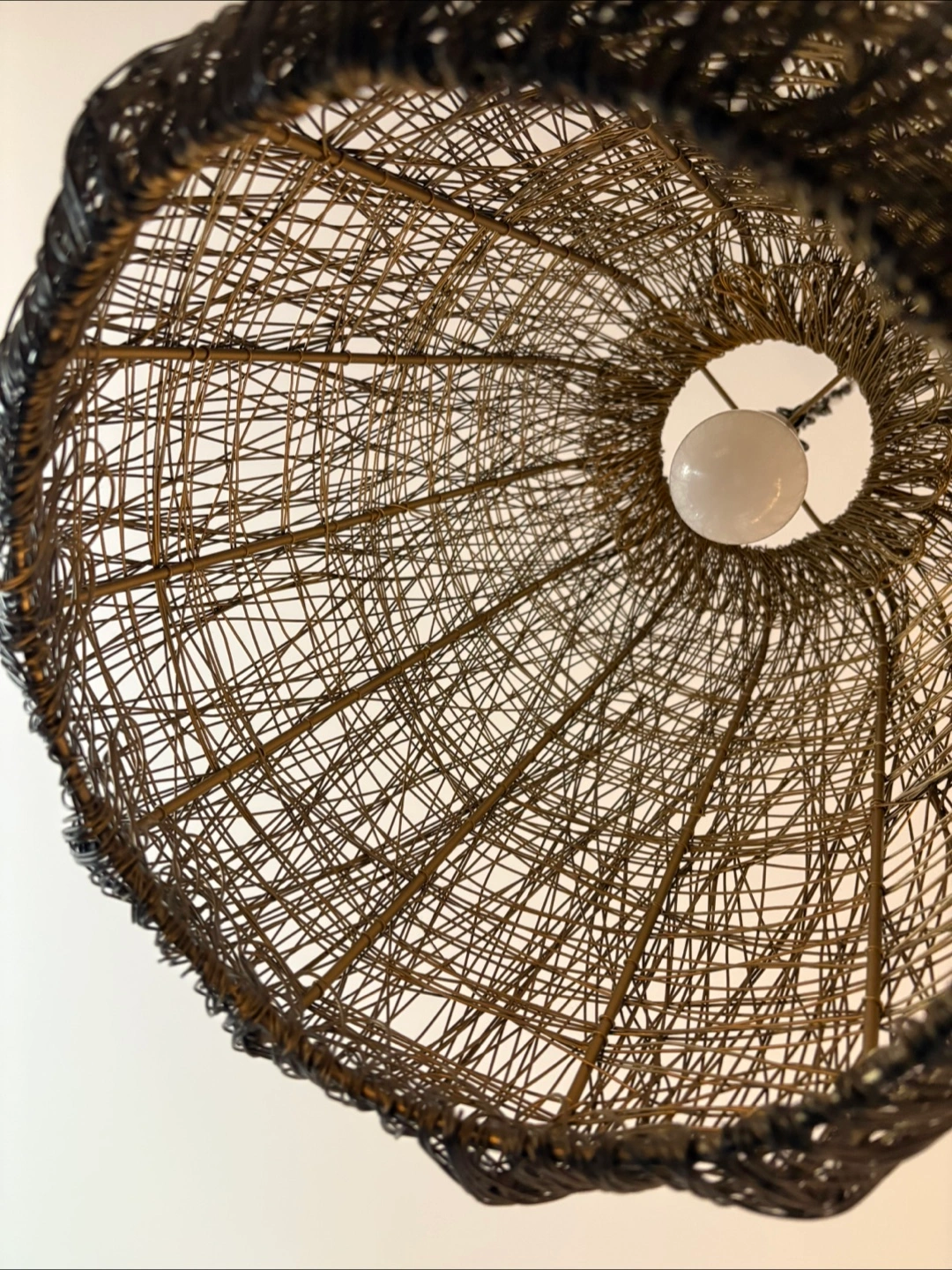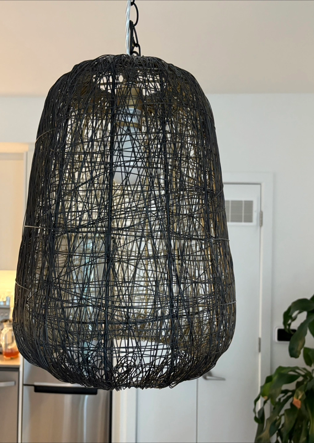 Selling a unique woven pendant lamp! It adds a lovely touch to any room with its intricate design and warm glow. Perfect for creating a cozy atmosphere in your home. Does not include lightbulb.