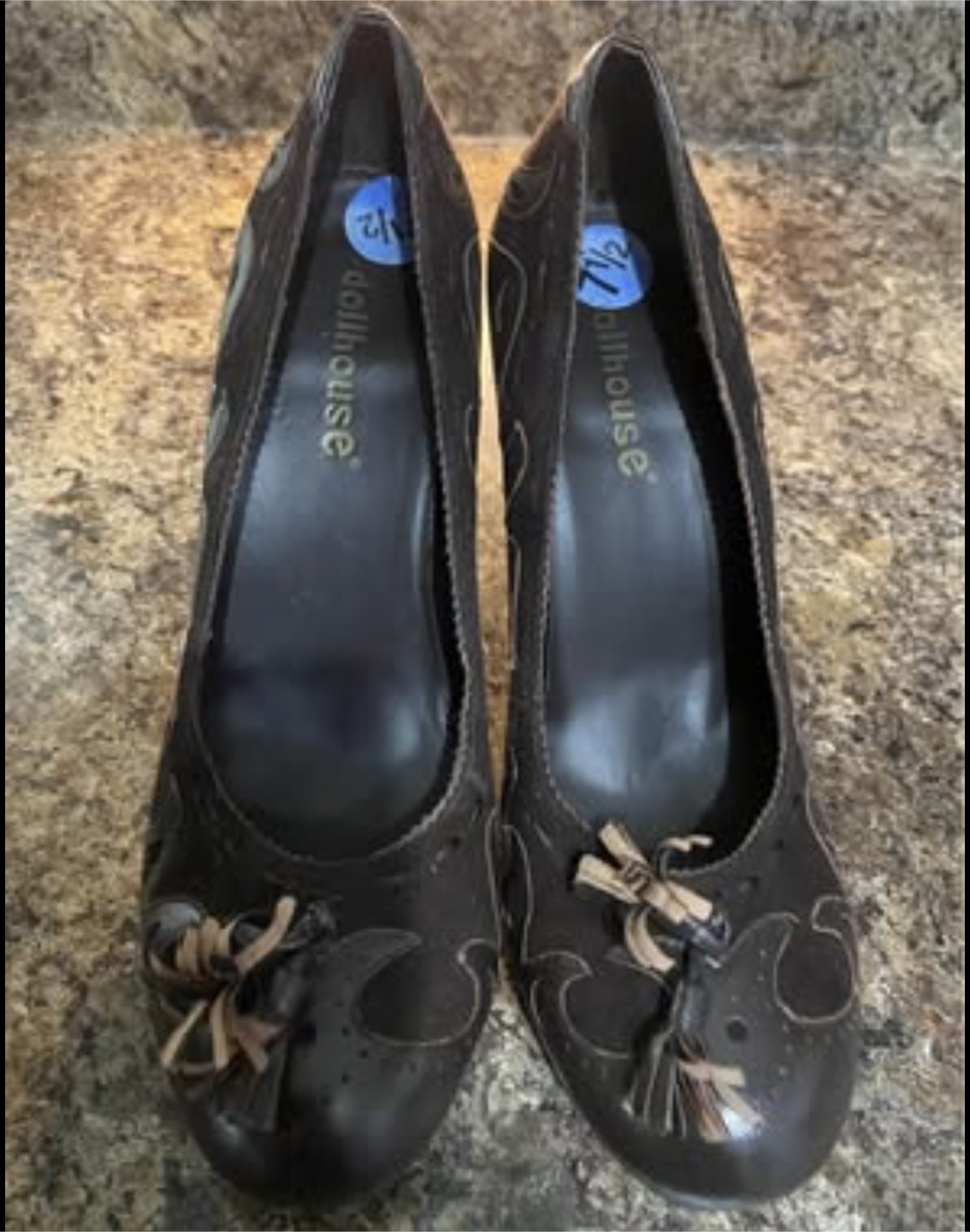 Cute pair of Dollhouse heels in a dark brown colour! They're a size 7.5 and have a unique design with a small tassel on the front. Perfect for adding a bit of flair to your outfit!
