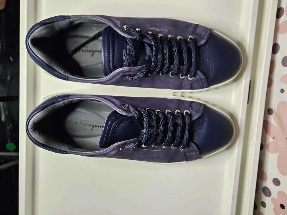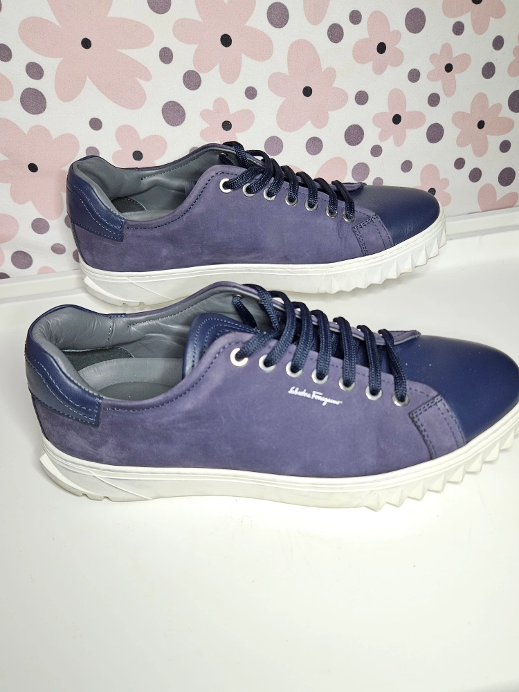 These Salvatore Ferragamo sneakers are in great condition! They feature a stylish design with a mix of navy blue and purple suede. Perfect for adding a touch of luxury to your casual outfits