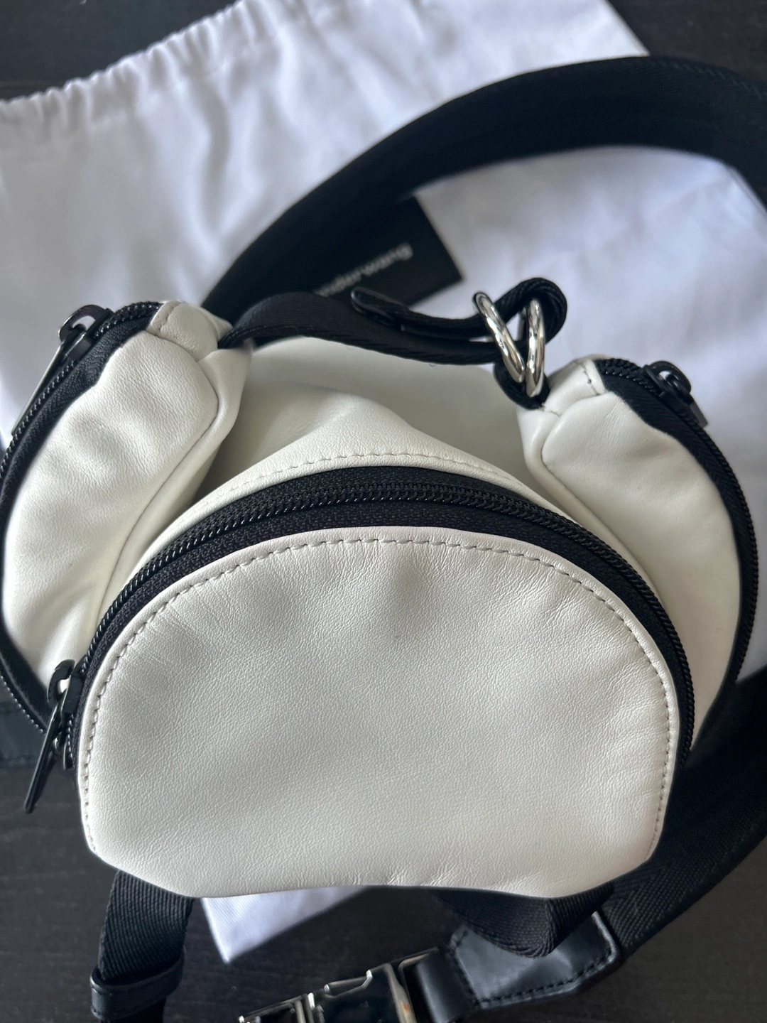 Alexander Wang Mini Ryan Satchel! It's in a lovely white leather with black accents. This mini bag is perfect for carrying your essentials in style. It's in great condition and comes with dust bag.