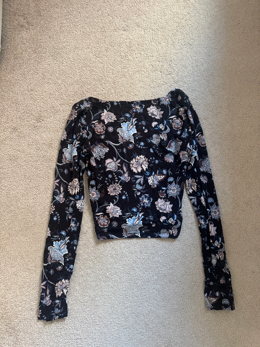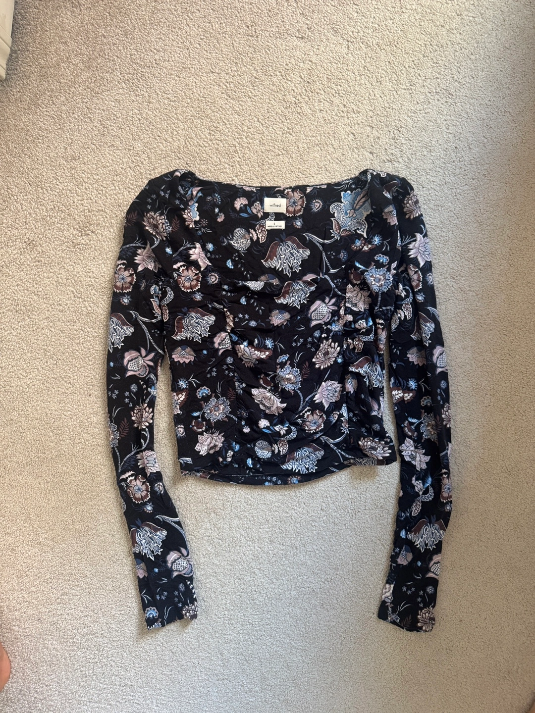 This is a Wilfred Free long sleeve top in size medium! It features a beautiful black floral pattern. Perfect for adding a touch of elegance to your wardrobe!