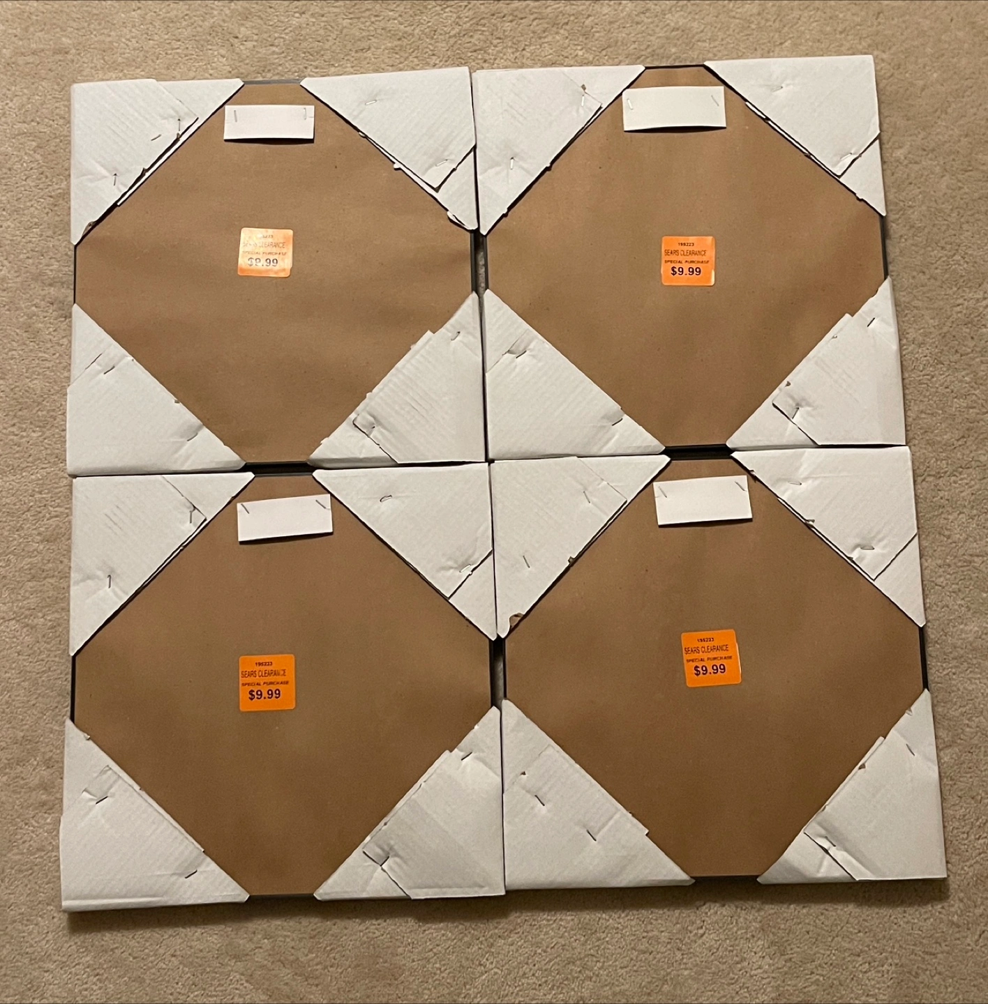 Selling a set of four brand new wall decor mirrors, still in their original packaging! They each have a rustic, silver-tone frame. The untouched package shows they were originally $9.99 each. Do your own arrangement, adding a silver touch to your wall.