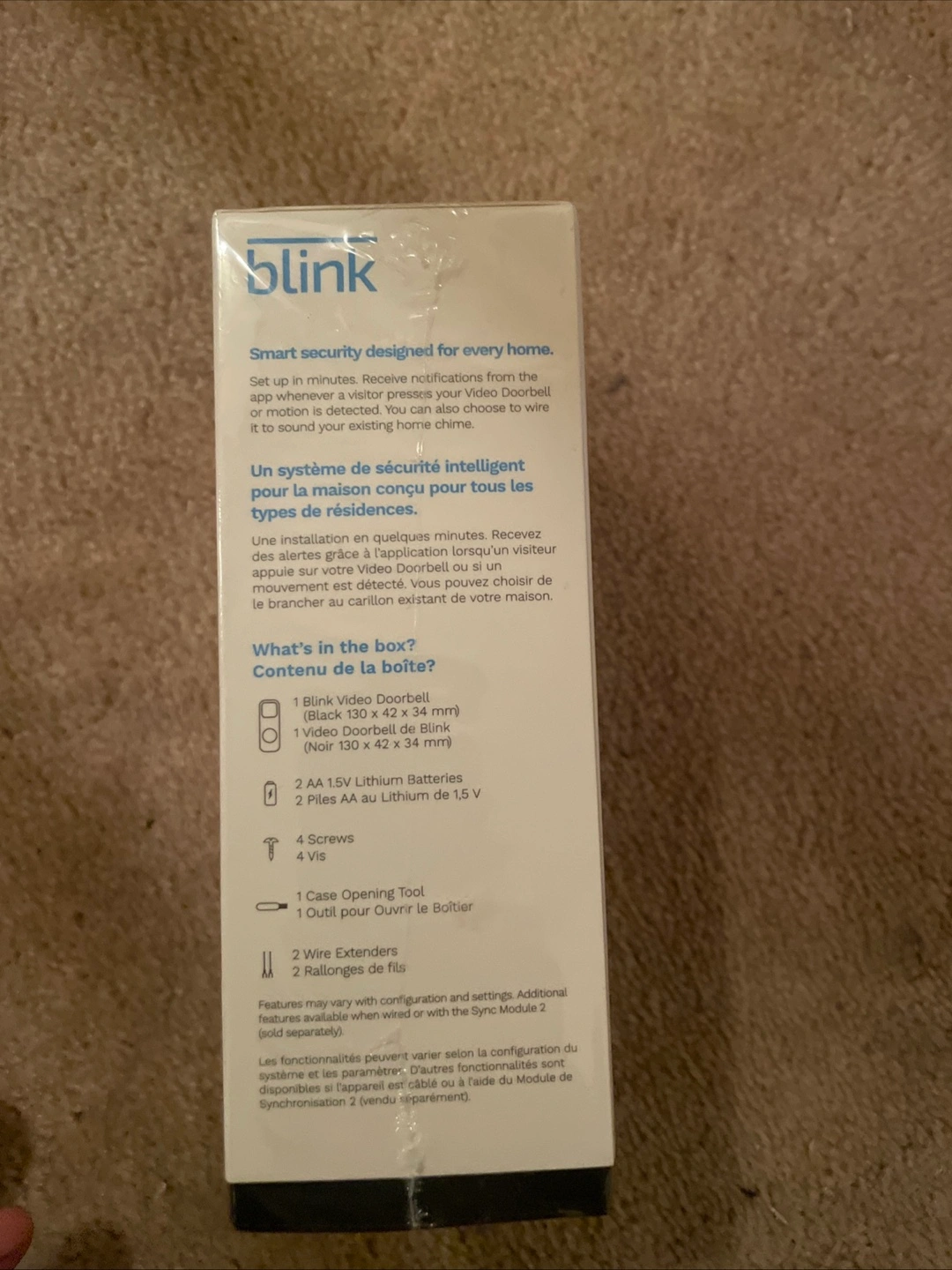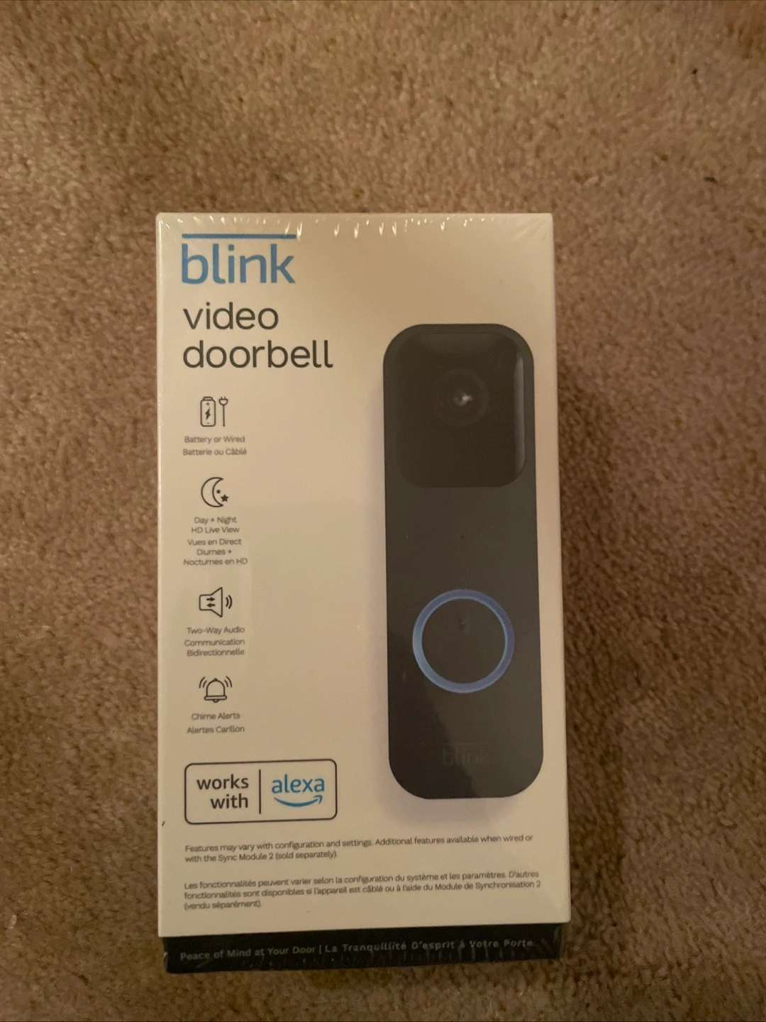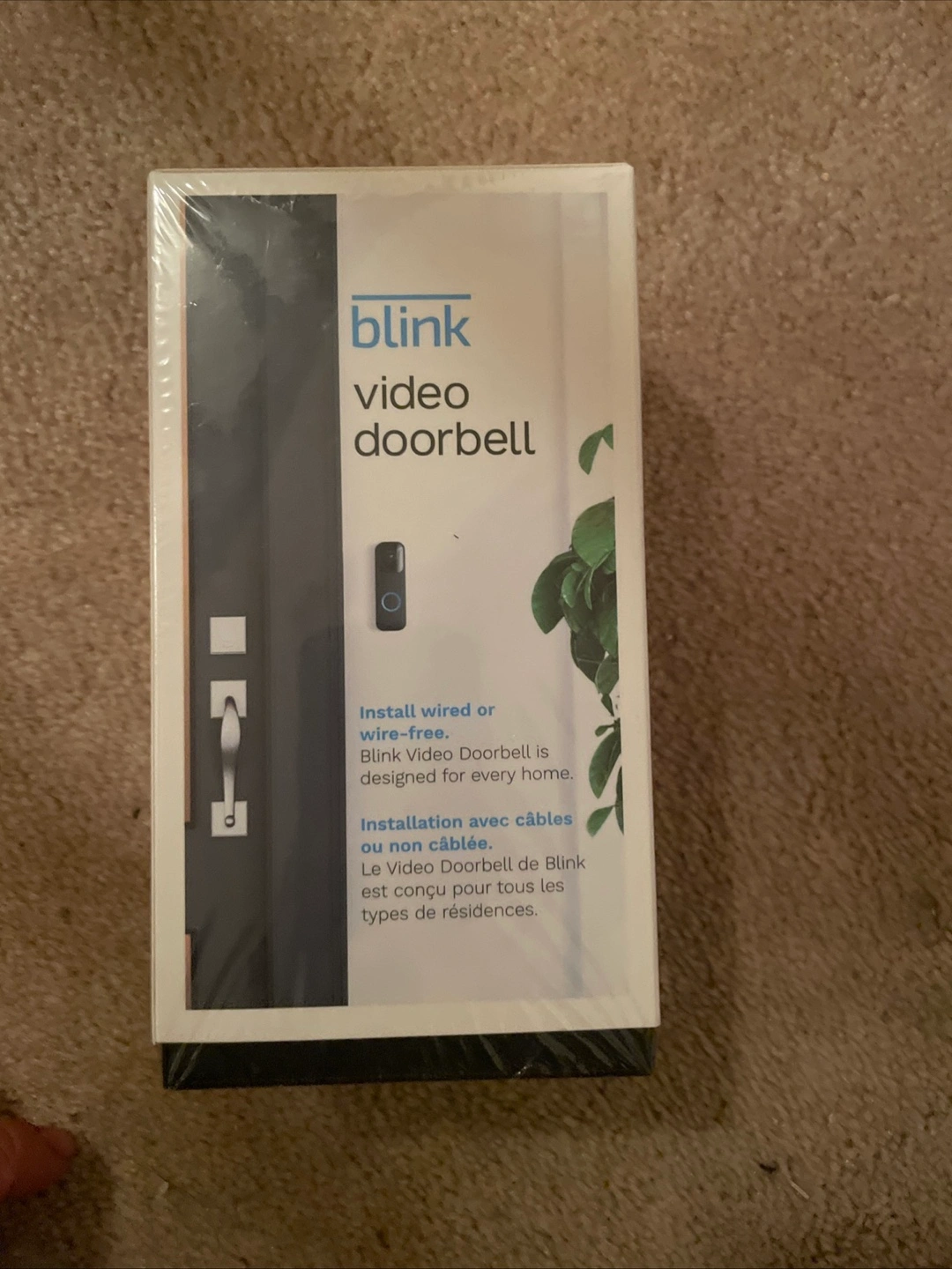 Selling a brand new Blink video doorbell in its original packaging! It can be installed wired or wire-free, and is designed for every home. Includes the doorbell (130 x 42 x 34 mm), 2 AA 1.5V lithium batteries, 4 screws, a case opening tool, and 2 wire extenders.