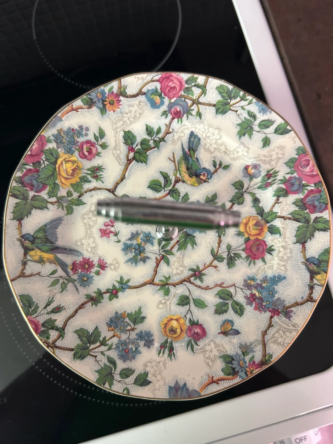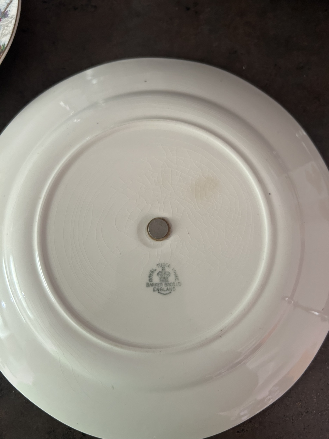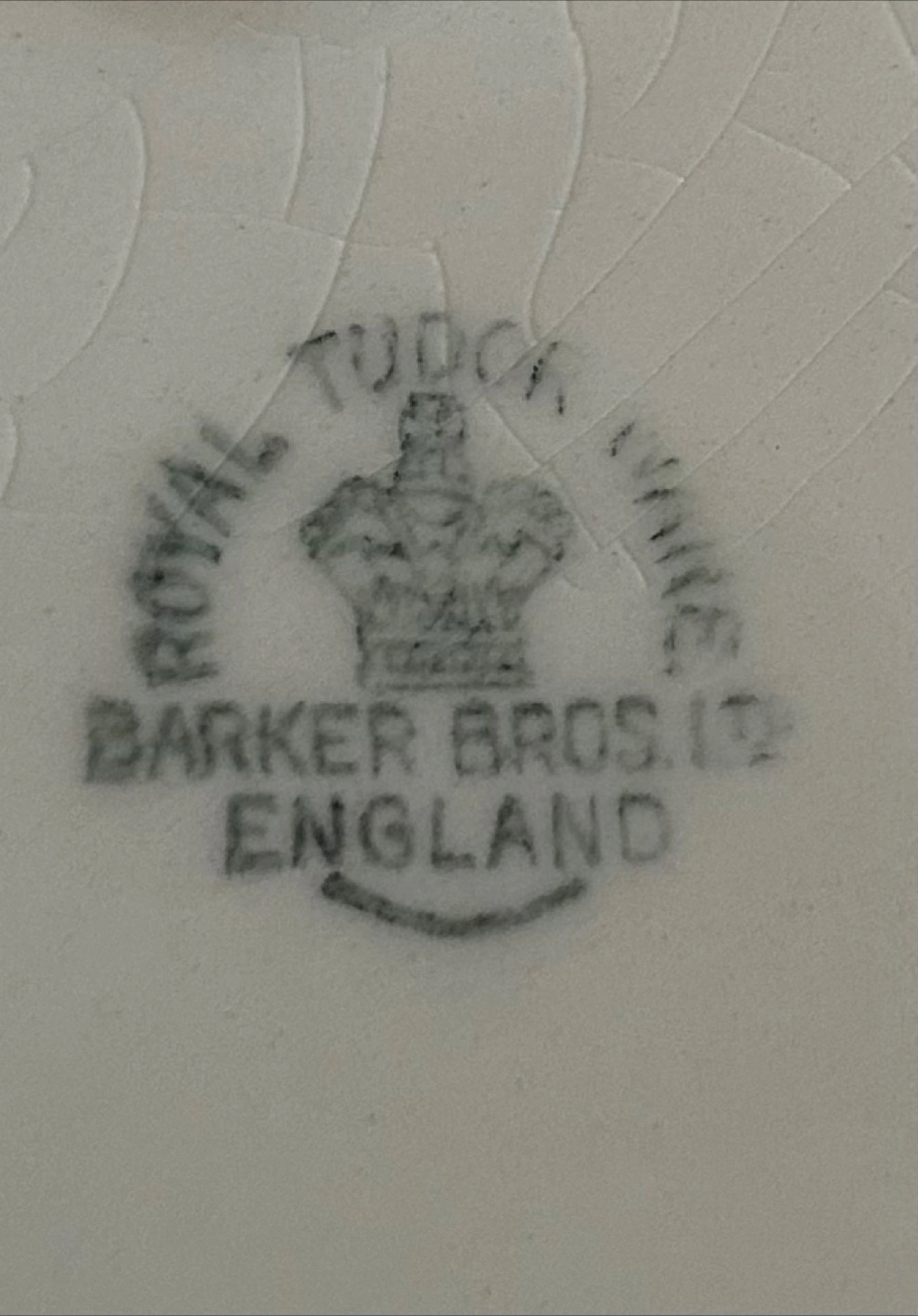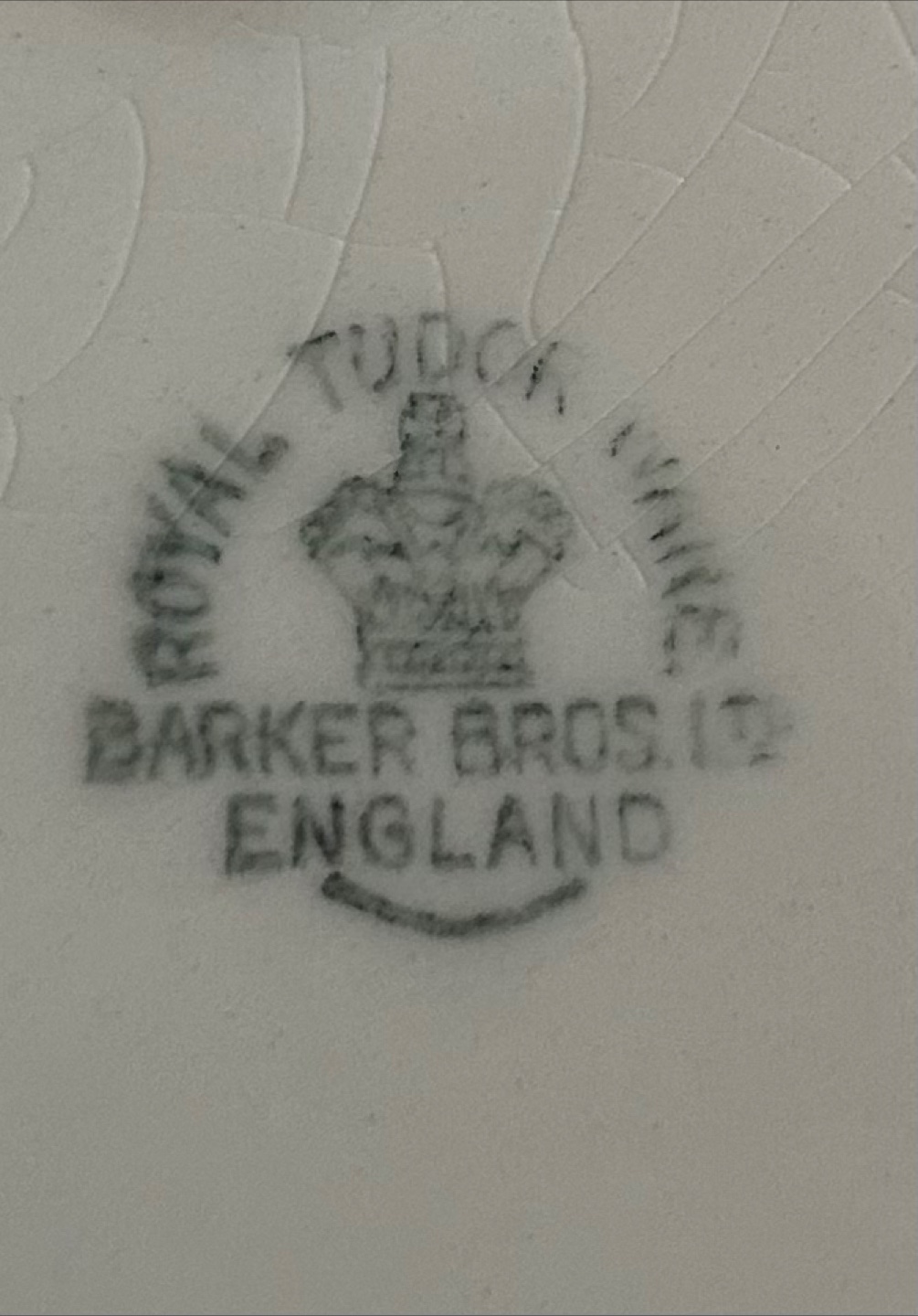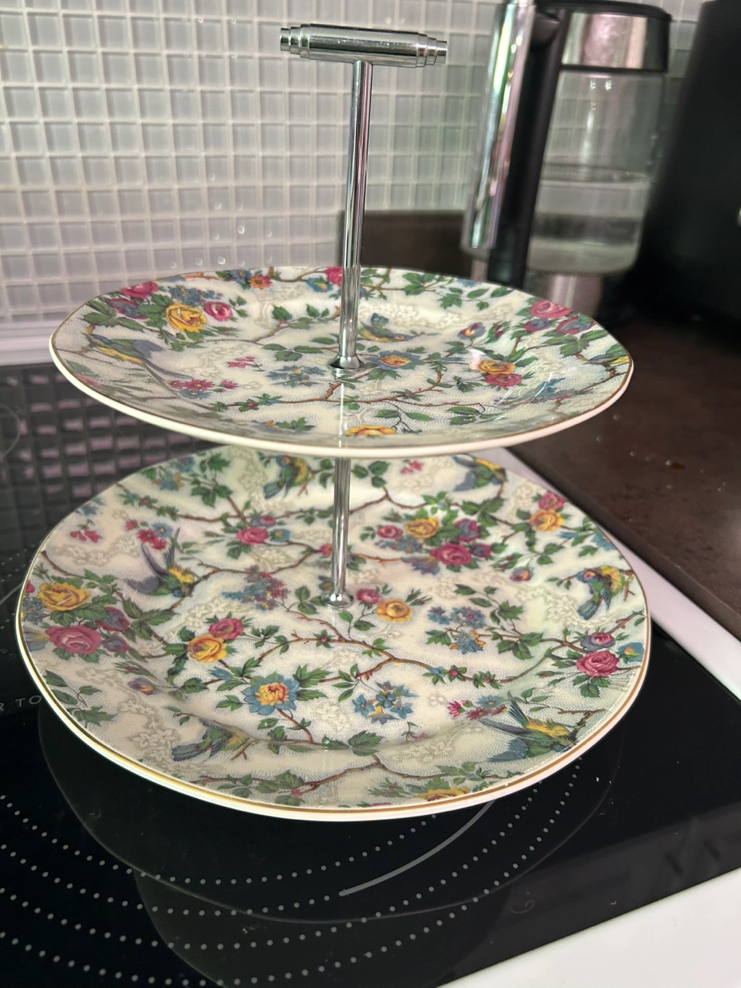 Selling a lovely two-tier serving tray made by Royal Tudor Barker Bros. in England! It features a beautiful floral and bird pattern with gold trim. Perfect for serving treats at your next gathering or adding a touch of vintage charm to your kitchen