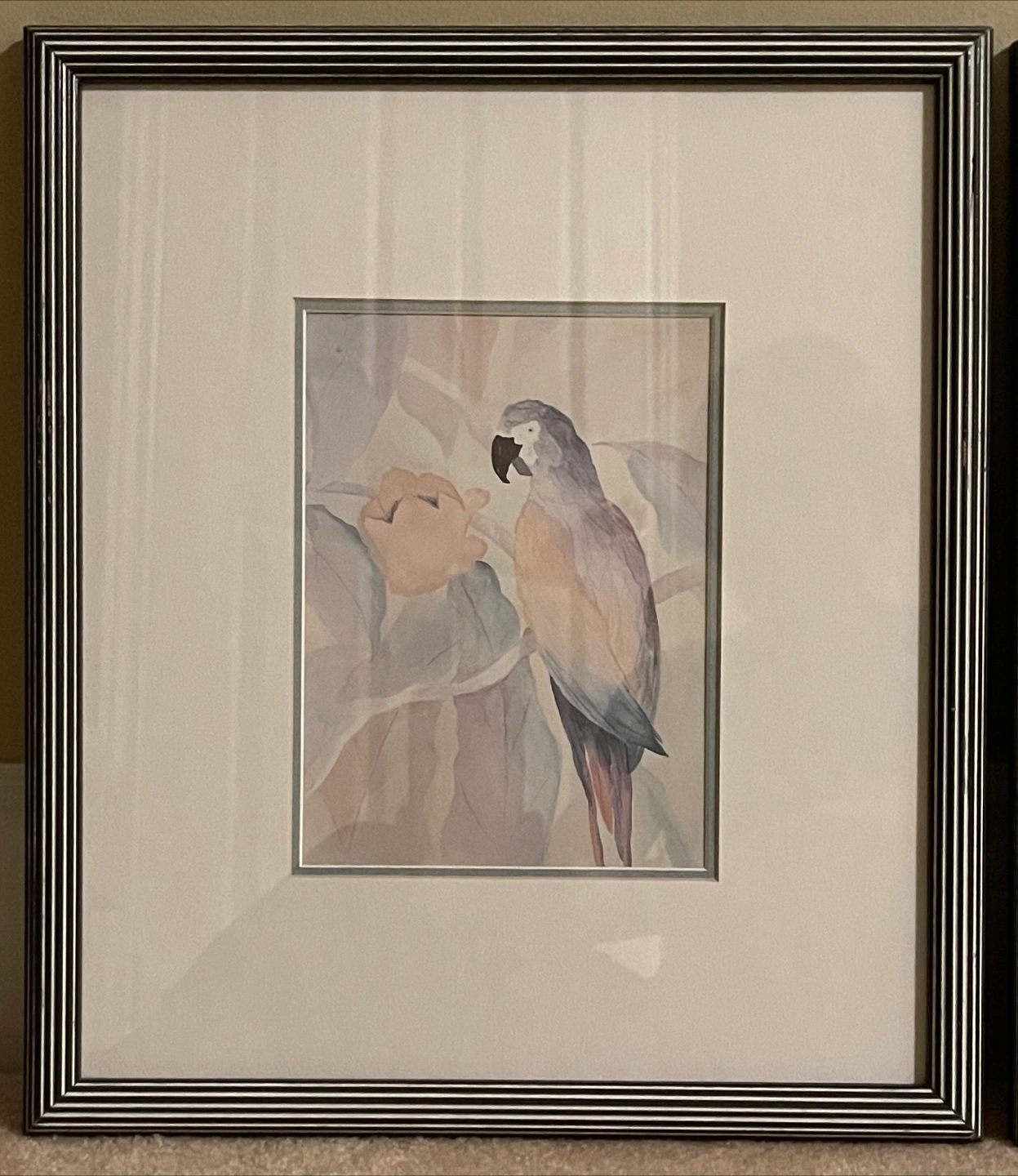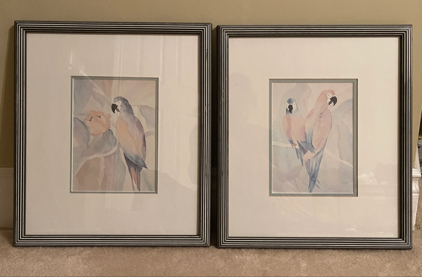 Selling a set of two framed parrot watercolor prints. They're in great condition and would look lovely in any room. The frames are grey and white striped design with minor scratches. Each print features a unique parrot illustration in soft, muted colours. Size is approximately 13”x15”.