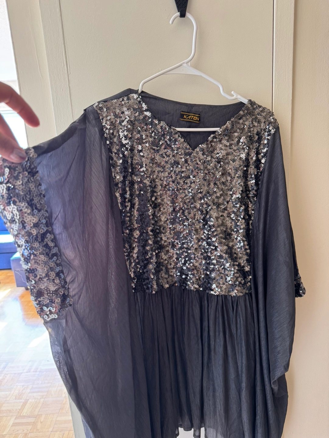 166This is a lovely grey dress from Katen. It features a sequined bodice and sleeves, adding a touch of sparkle to your wardrobe. It's perfect for a special occasion or a night out!