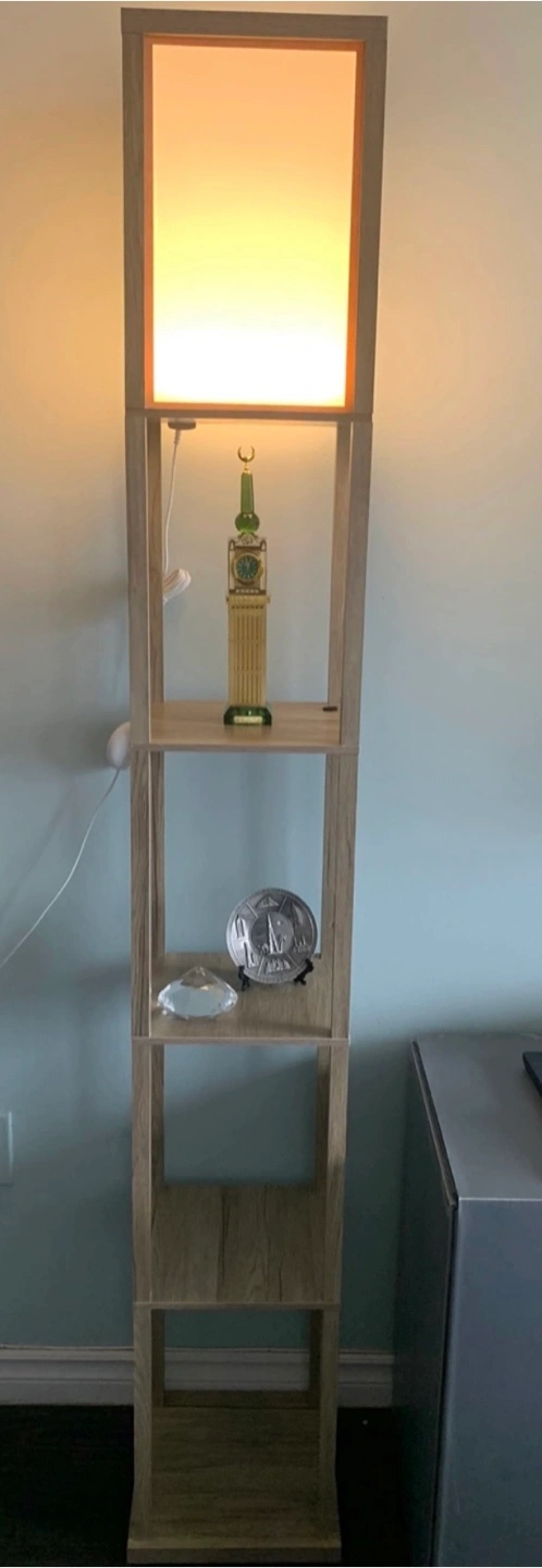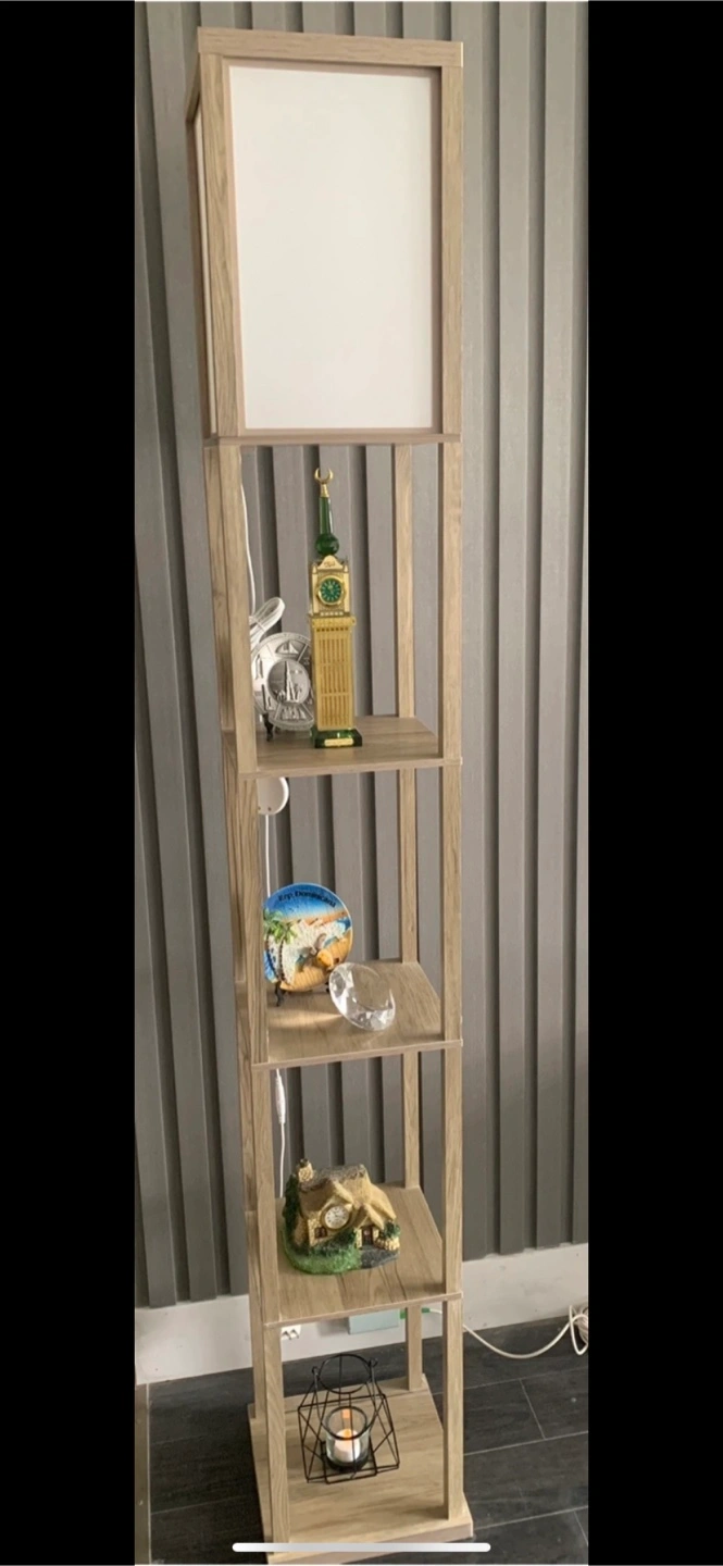 This shelving floor lamp is in great condition and ready to brighten up your space! It features a modern design with four shelves, perfect for displaying your favourite items or adding some extra storage. The light is soft and ambient, creating a cozy atmosphere in any room. Used but look like new .