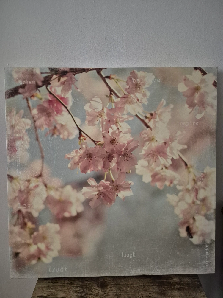 Beautiful canvas wall art featuring a delicate cherry blossom design with inspirational words like 'dream,' 'believe,' and 'laugh' that you hardly see in canvas.