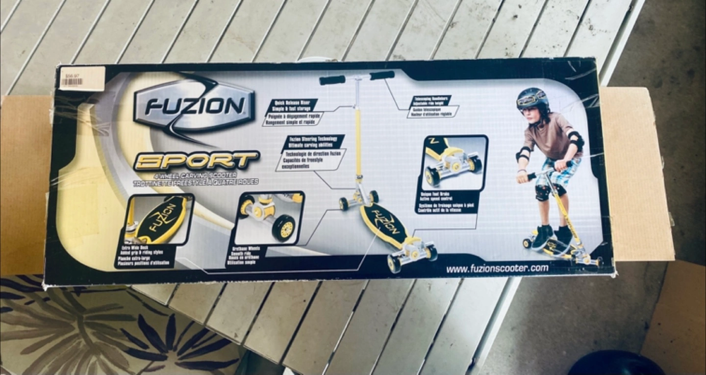 Best choice for your kid’s first scooter! It's in great shape and ready for some fun. This freestyle scooter is perfect for riders aged 6-8 years and up to 100 lbs (45 kg). It features an extra wide deck and 4 urethane wheels for stability and a smooth ride. All steel construction and a telescoping handlebar. Box and instruction manual included. Pair it with a good, multi-sport Bell helmet for $8.