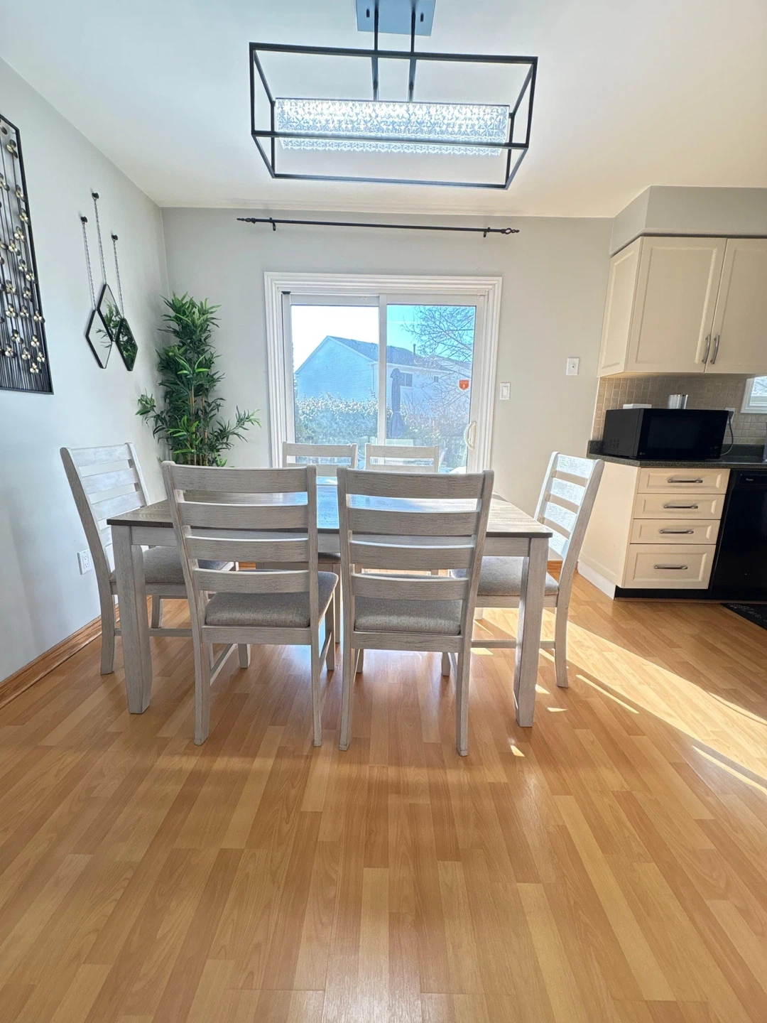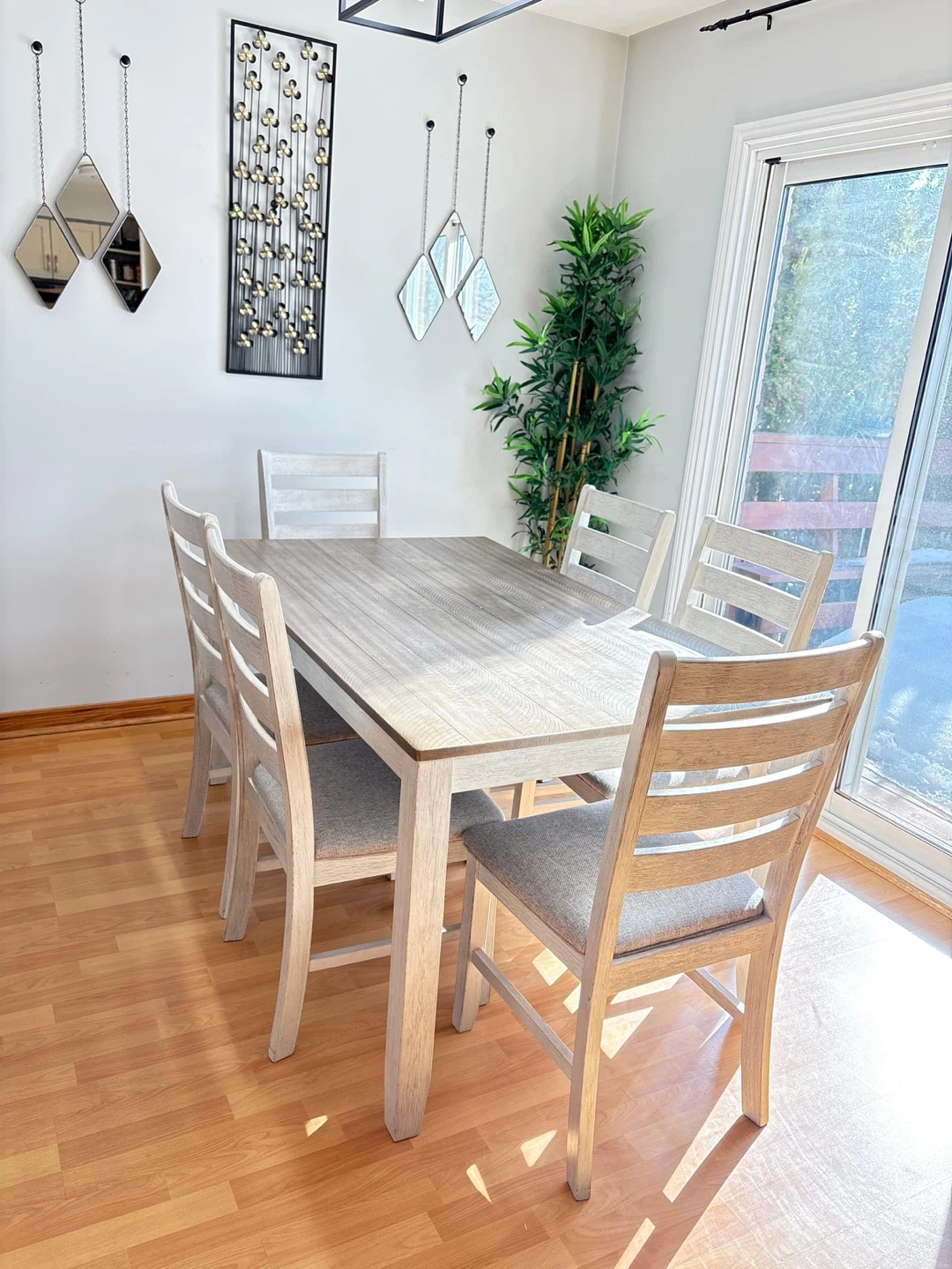 This is a modern dining set with a light wood-look table and four upholstered chairs. The chairs have a slatted back design and grey fabric seats. It's a great set for a kitchen or dining area.