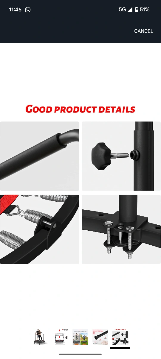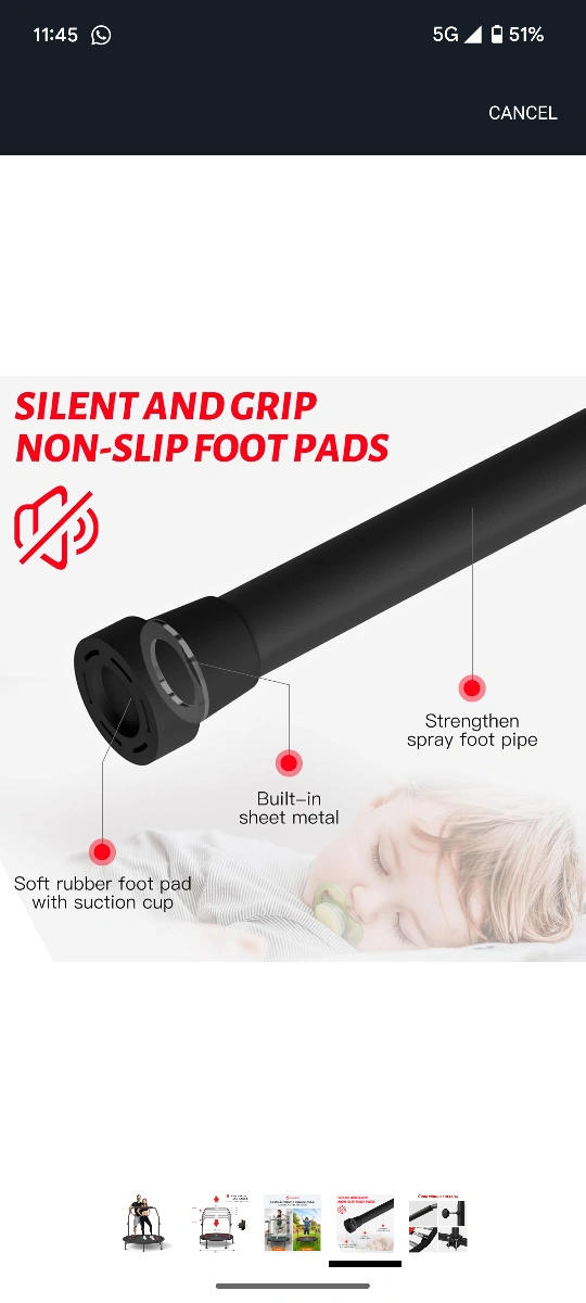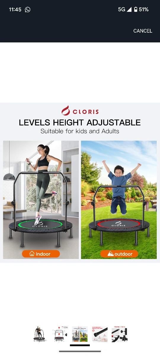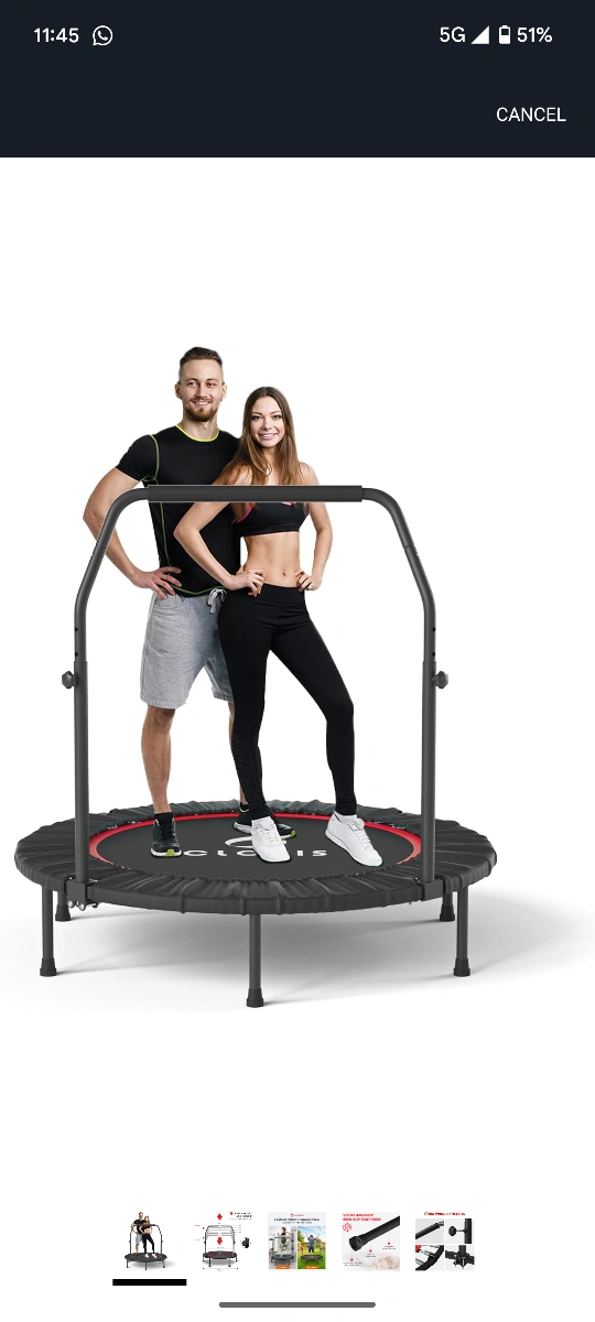 Check out this Cloris mini trampoline! It features an adjustable handle bar with 5 height levels, making it suitable for both kids and adults. The trampoline has silent and grip non-slip foot pads, ensuring a safe and quiet workout. It measures 40.5 inches in diameter and the handle bar height can be adjusted from 27.1 inches to 35.4 inches. Perfect for indoor or outdoor use!