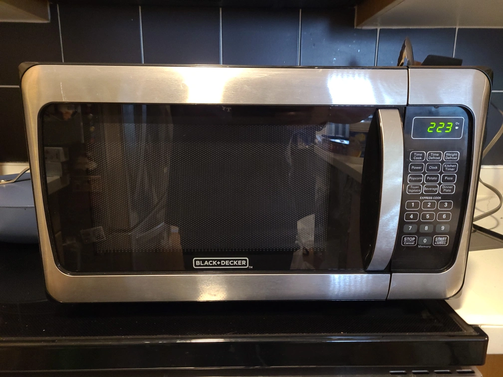 Large Black+Decker 1.1 cubic feet microwave in excellent condition and fully functional. Perfect to place on countertops to heat up food quickly.