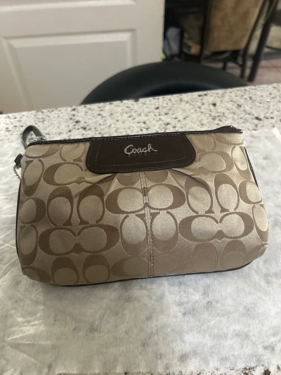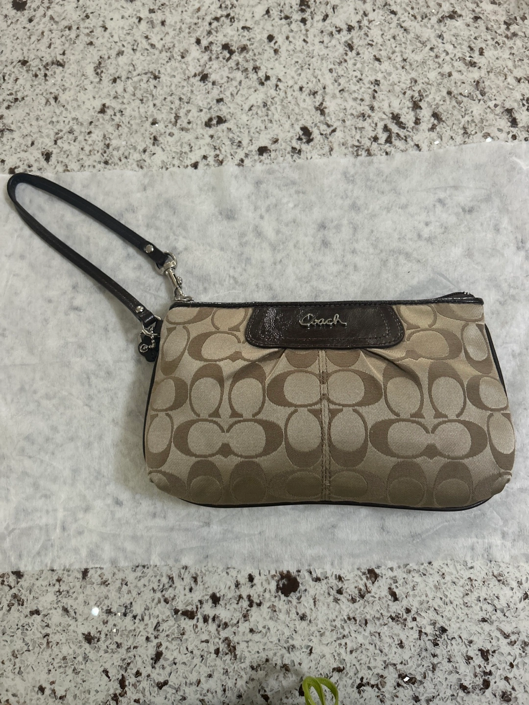Selling a Coach wristlet in good condition! It's a stylish and convenient accessory for carrying your essentials. The wristlet features the classic Coach logo pattern and a comfortable wrist strap. Perfect for a night out or everyday use!