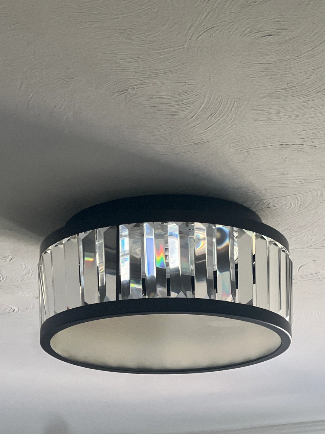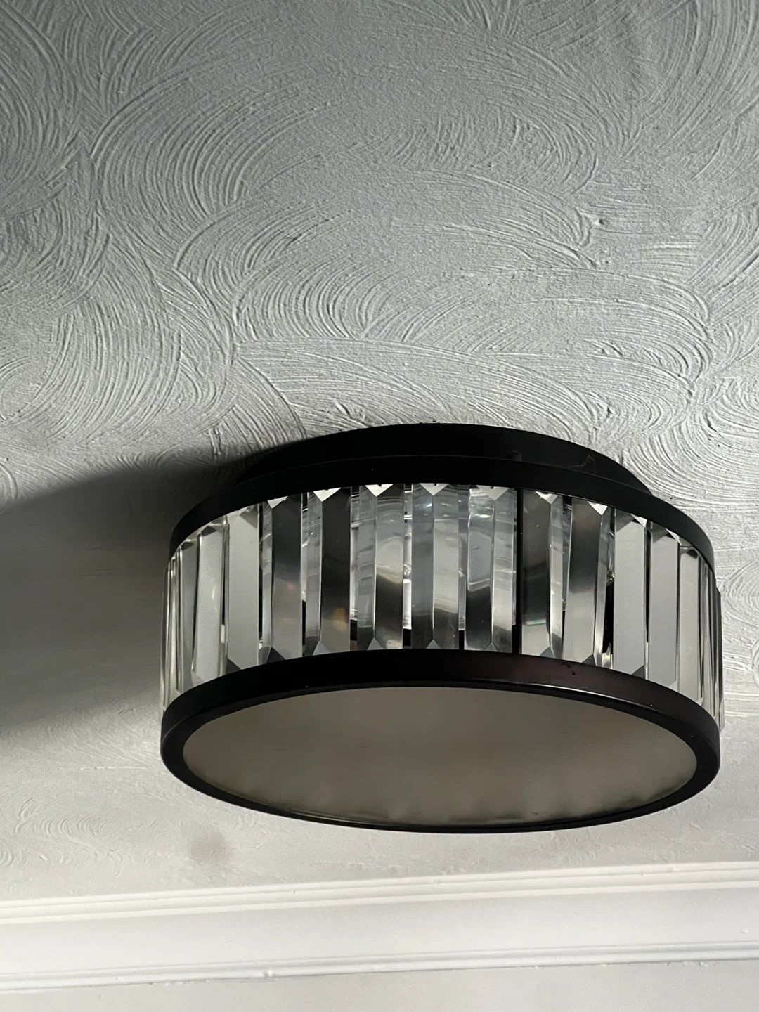 Selling a flush mount dimmable ceiling light. It has a dark brown frame and clear decorative crystals around the shade and shines bright! It would be a great addition to any room!