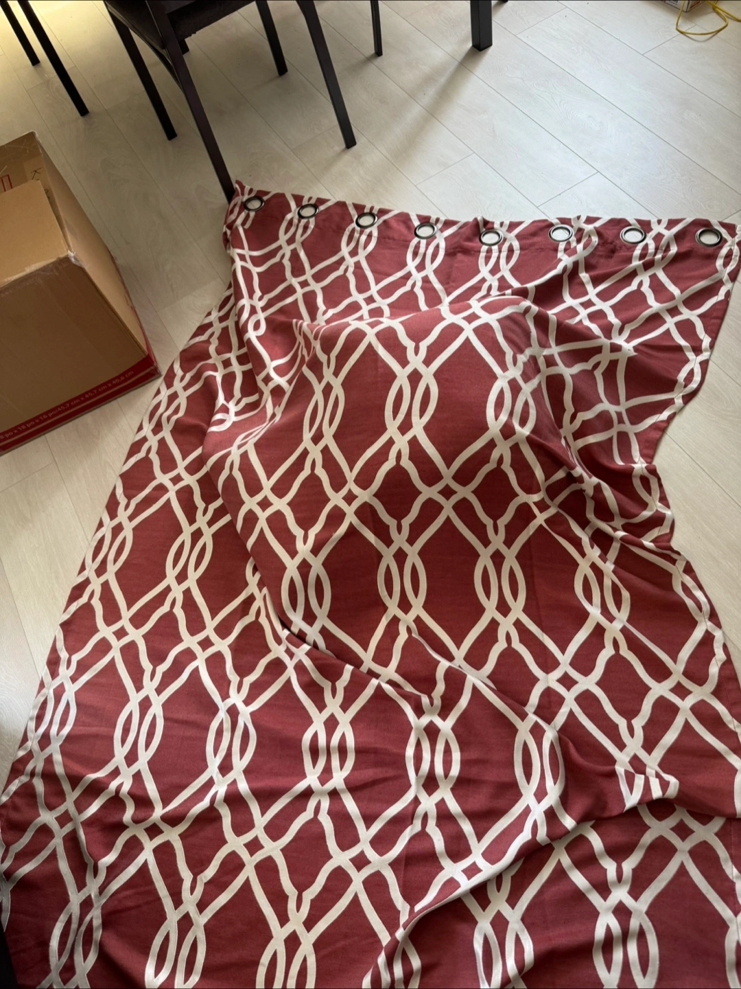 I have a set of burgundy and white patterned curtains for sale. They're in great condition and would look lovely in any room!