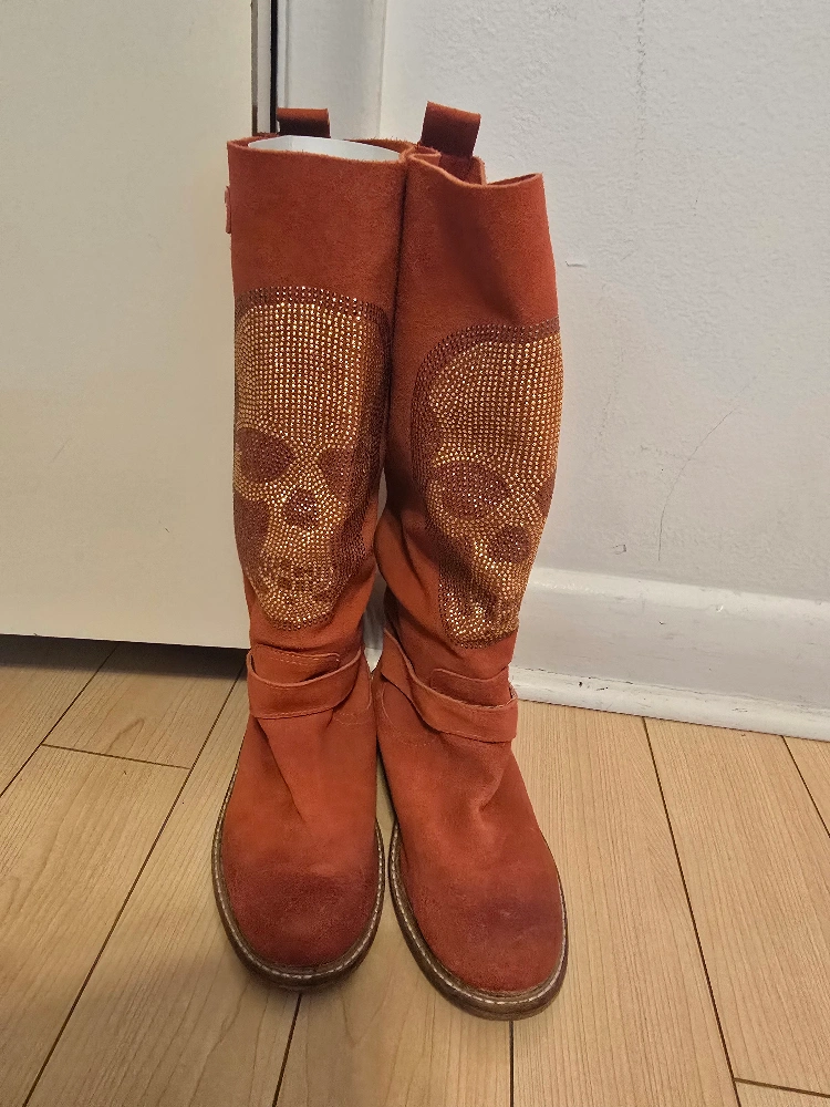 These orange suede boots are sure to make a statement! They feature a unique skull design made of small studs. They're in good condition and ready for a new home!