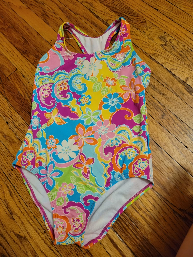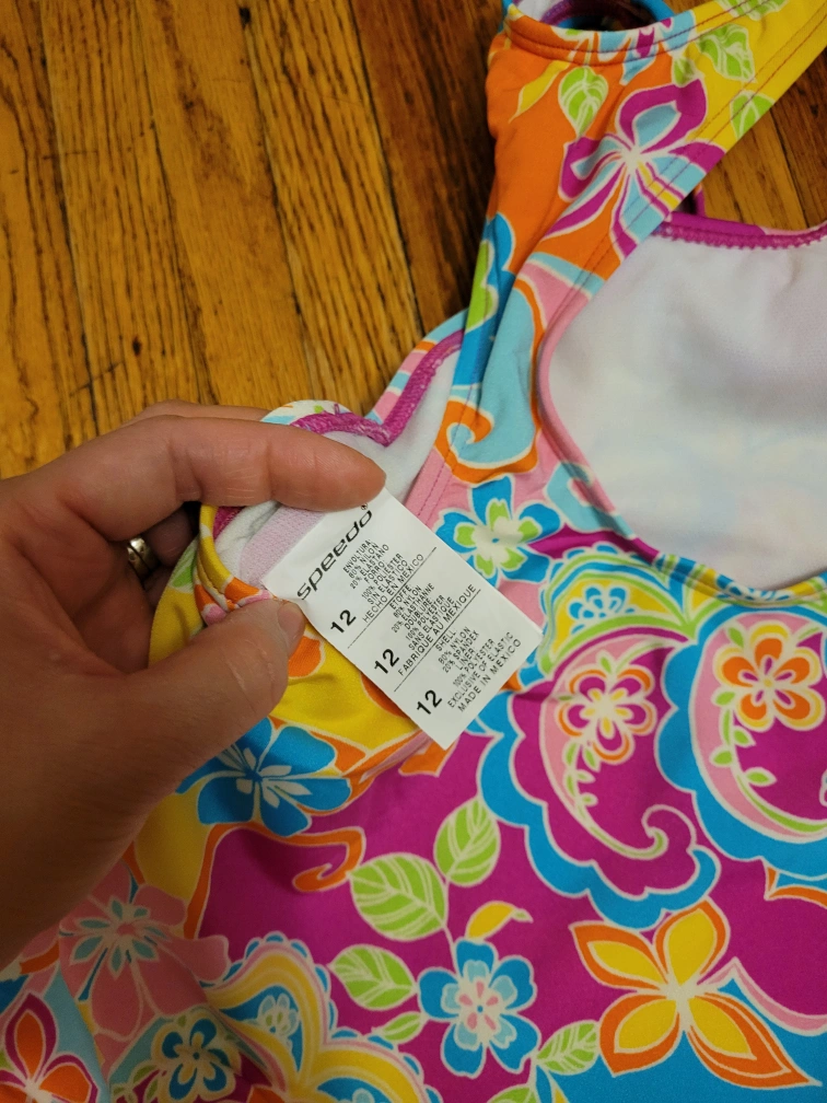 This is a super cute Speedo girls' swimsuit in size 12 girls! It features a vibrant floral pattern with lots of fun colours. Great for swimming lessons or fun at the beach.