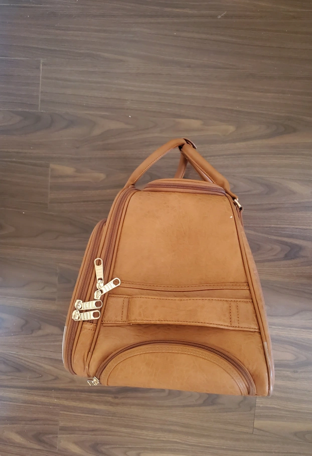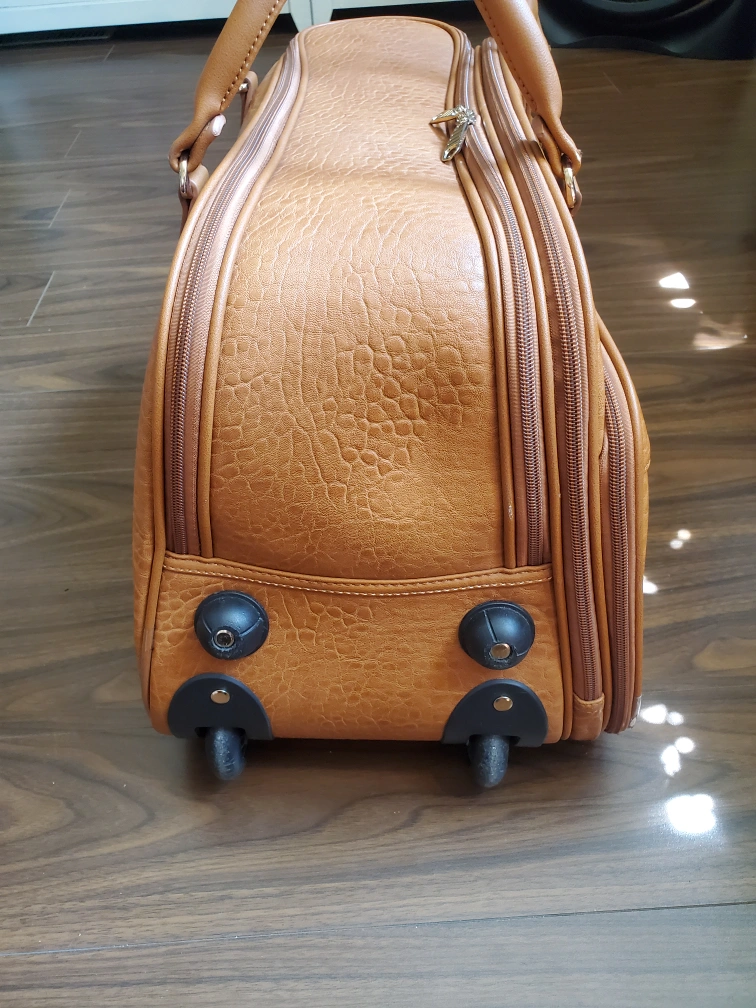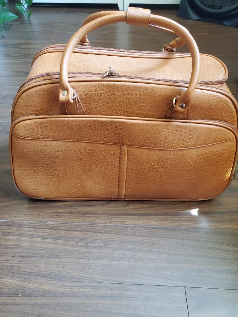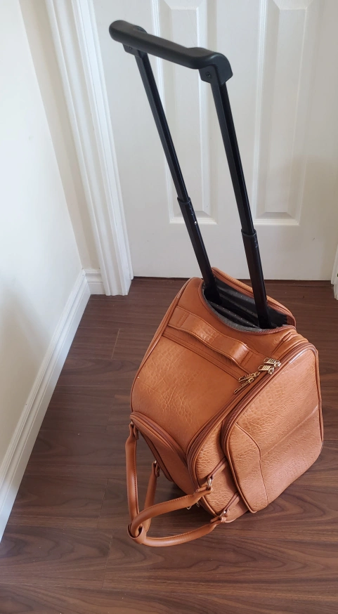 Selling a used rolling suitcase in brown. It has a retractable handle and wheels for easy transport. Perfect for short trips or as a carry-on! Very good condition