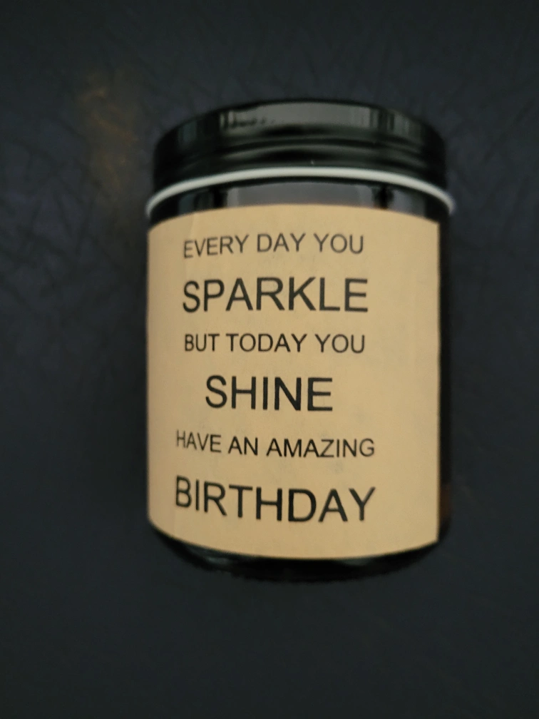 Lavender sage scented candle, natural hand poured with 9 oz of soy wax. It says 'Every day you sparkle but today you shine have an amazing birthday' on the label. Comes in its original box too