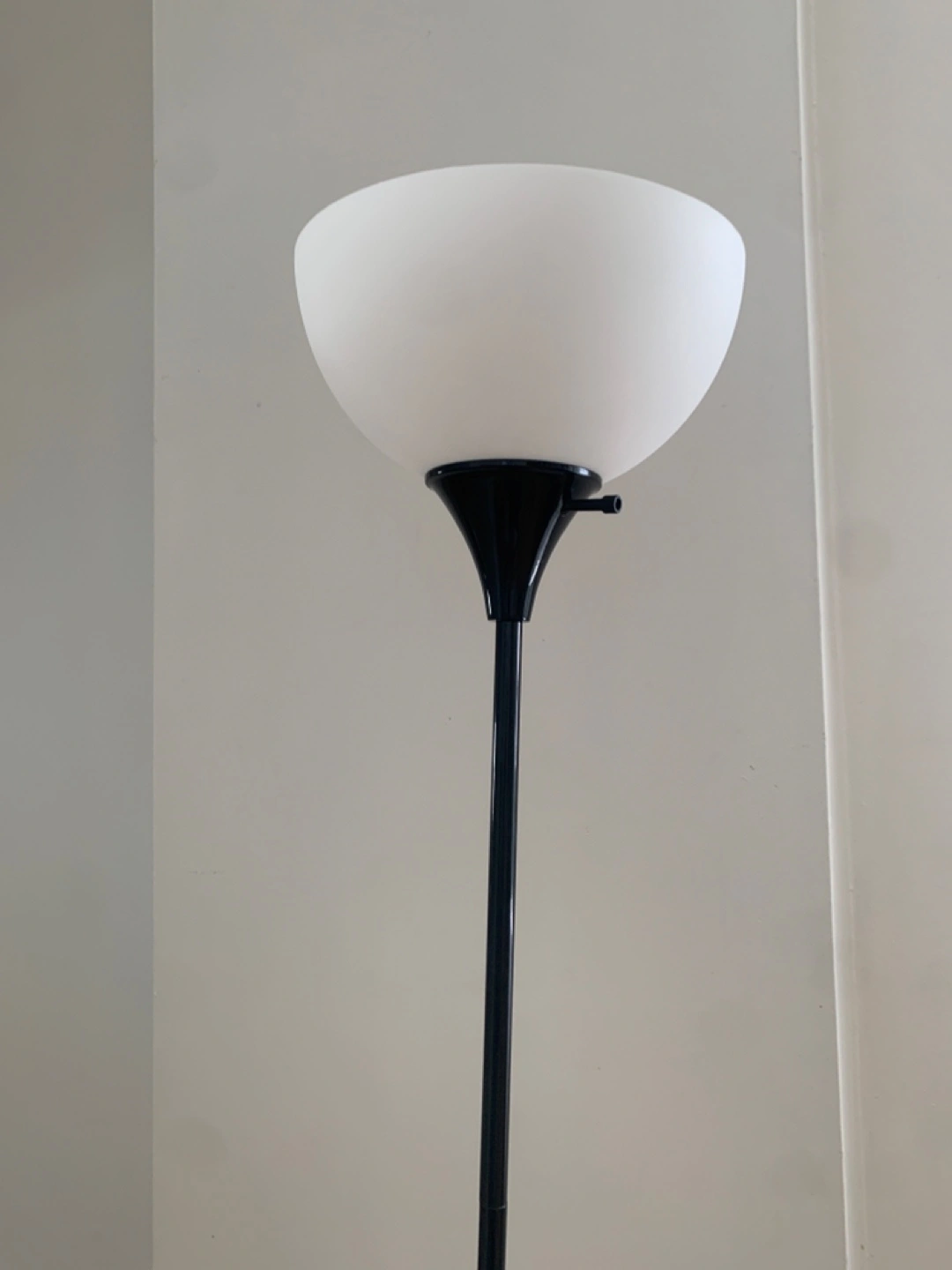 Selling a floor lamp with a black stand and a white shade. It's in great condition and would look great in any room. It's a simple and stylish lighting solution!