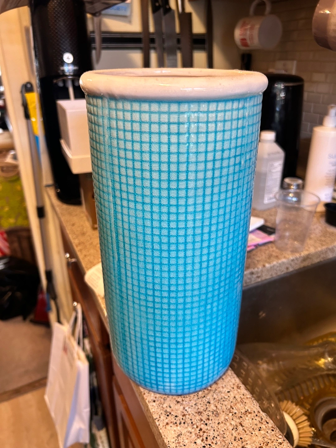 Selling a lovely blue ceramic vase. It's in excellent condition and ready to brighten up any room! The vase features a unique grid pattern and a smooth, glossy finish. The bottom has a sticker that says, 'This product made with safe paint. We care.'