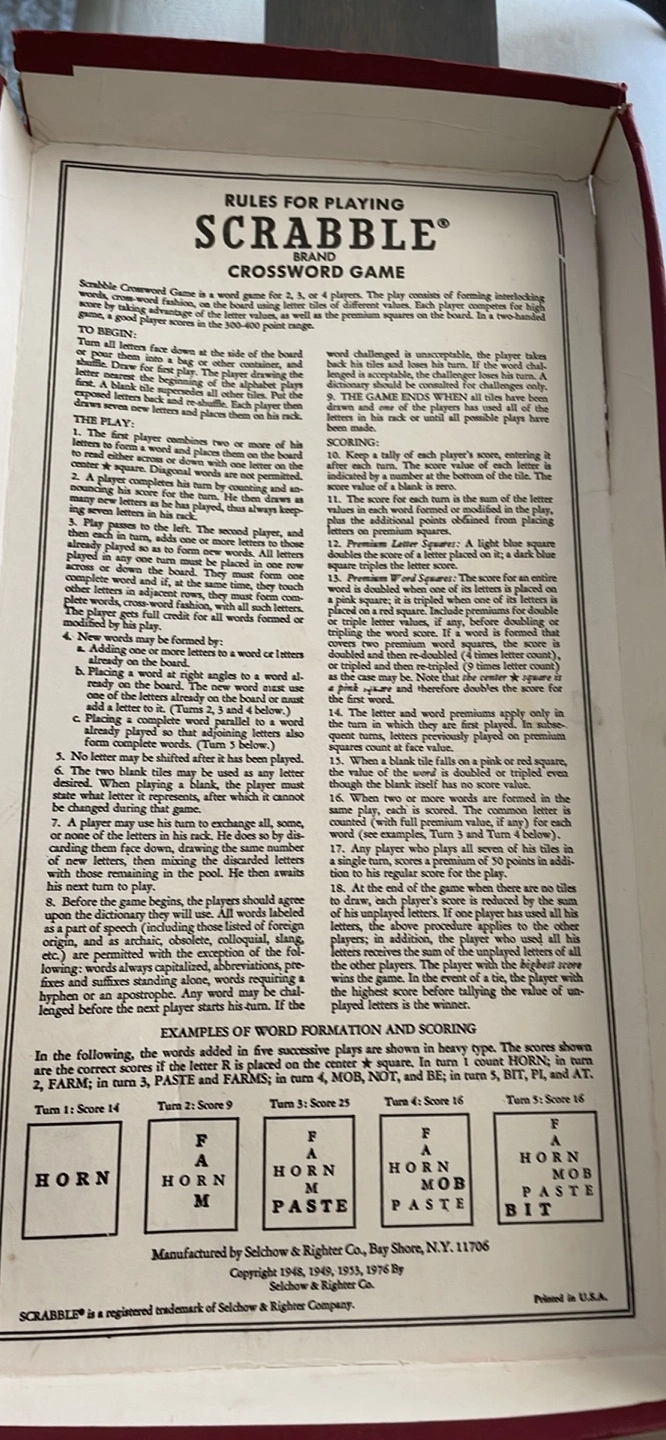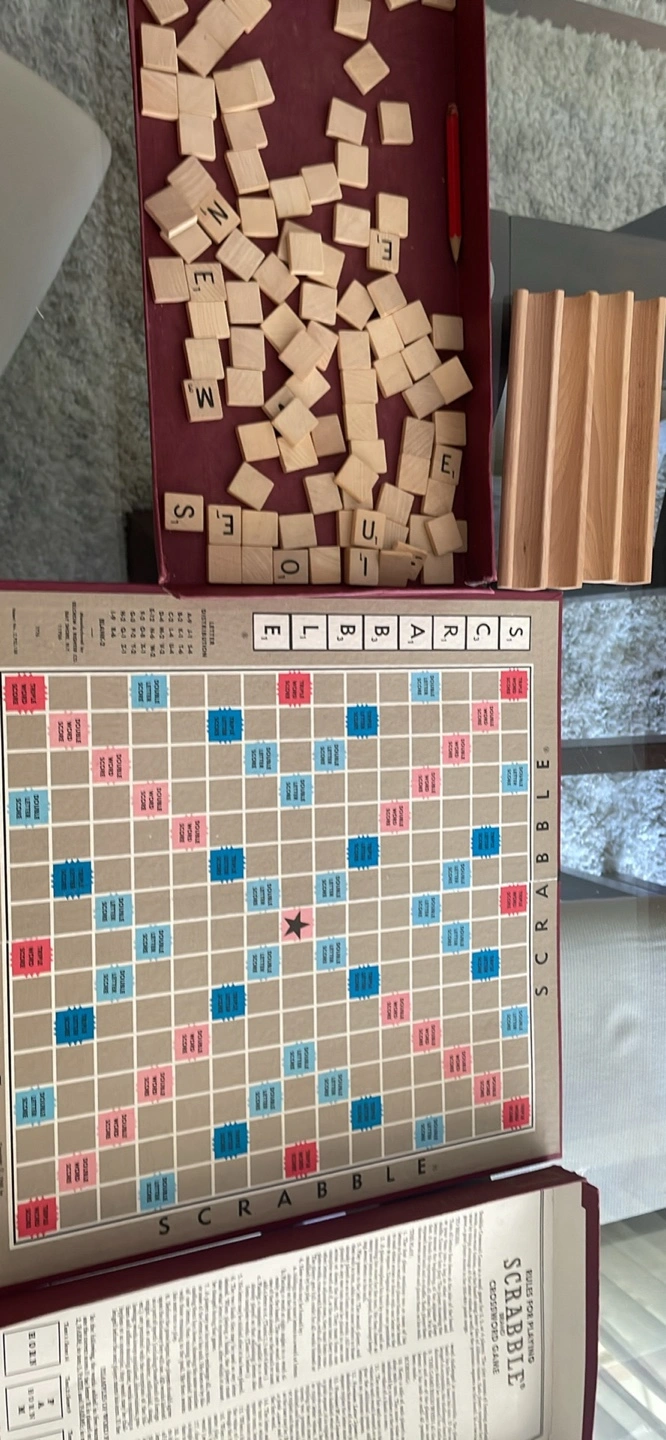 SCRABBLE. Vintage . MADE IN THE EARLY 1900’s. GREAT SUMMER FUN FOR THE COTTAGE & WINTER INDOORS. THIS ONE HAS THE ORIGINAL 100 tiles. ORIGINAL BOARD AND TILE HOLDER. A NICE PIECE OF GAMES. Pick up this great piece at Fitzgibbon avenue Scarborough. Midland and Eglinton