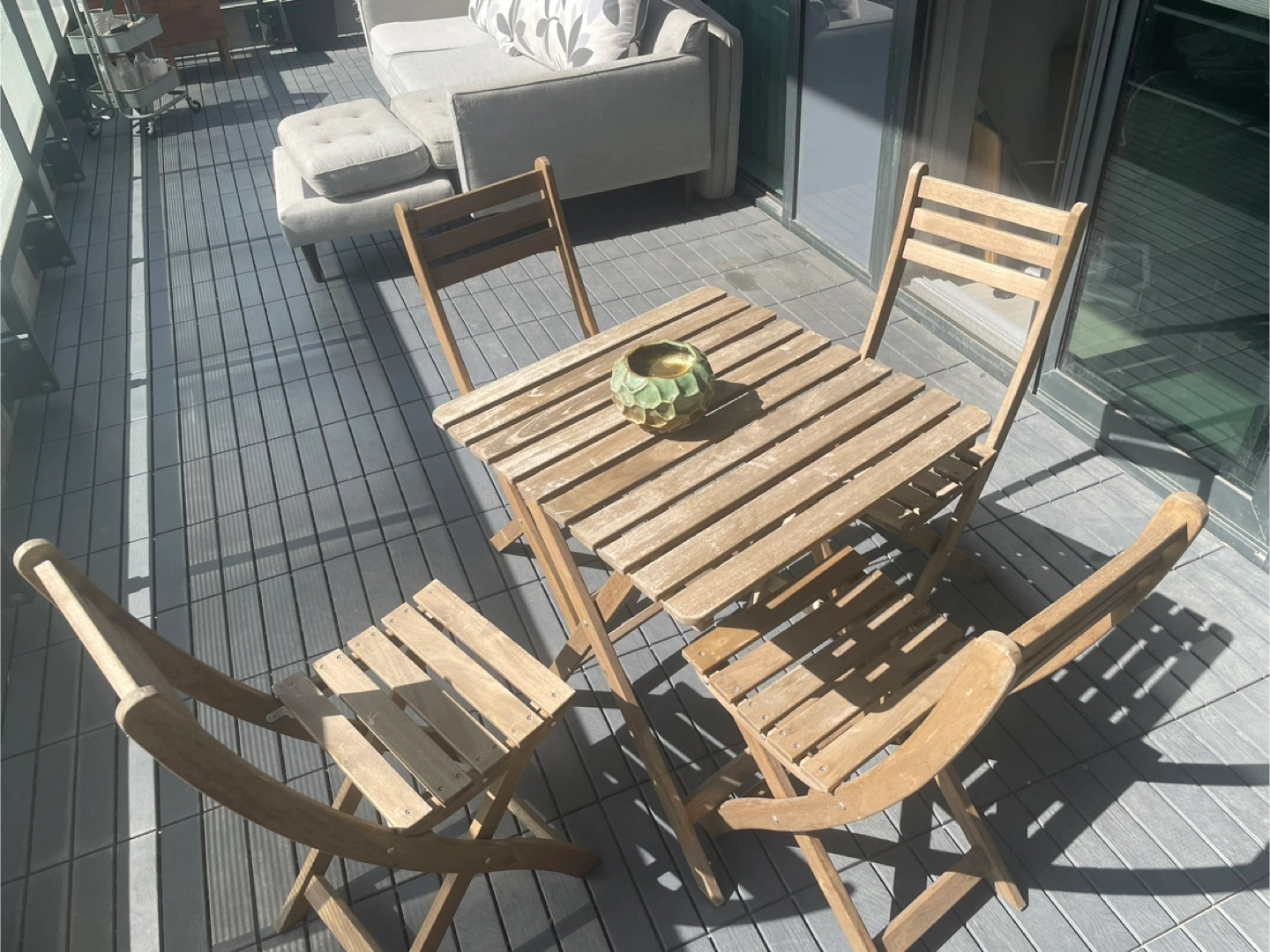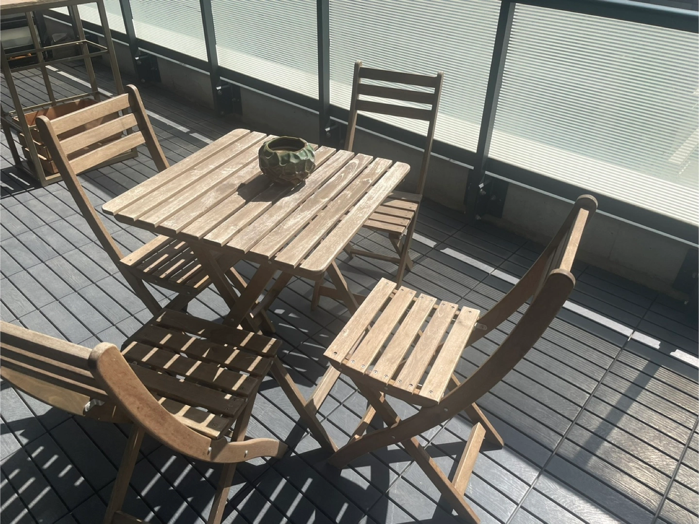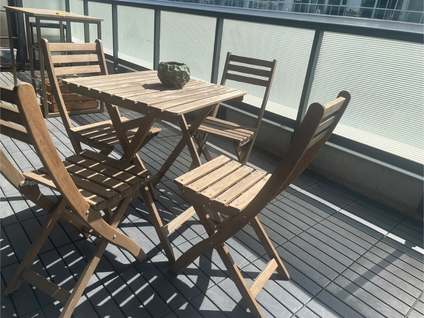 Selling a cute wooden patio set, perfect for enjoying the outdoors! Includes a square table and four matching chairs. It's in good condition and ready for your balcony or patio
