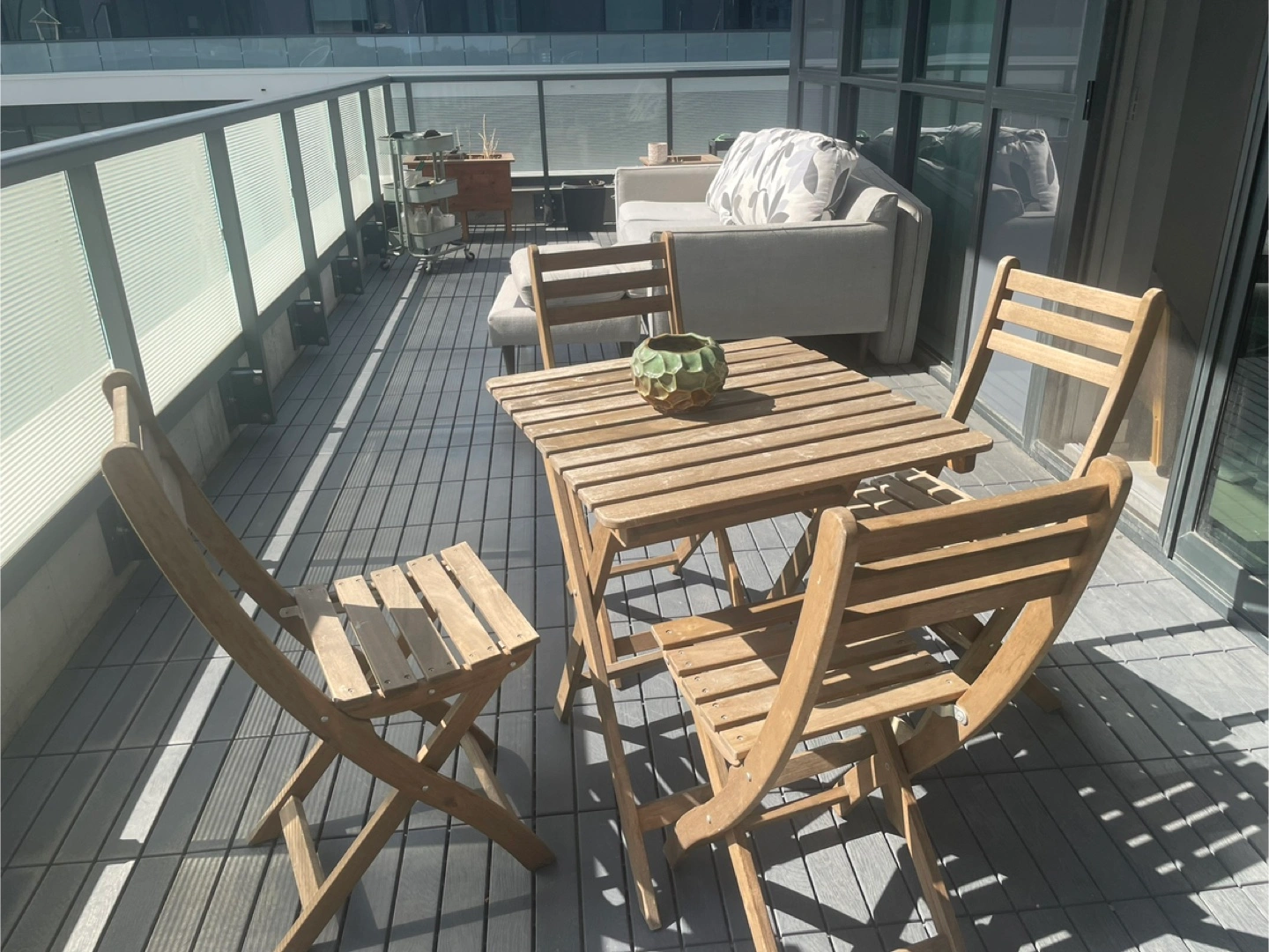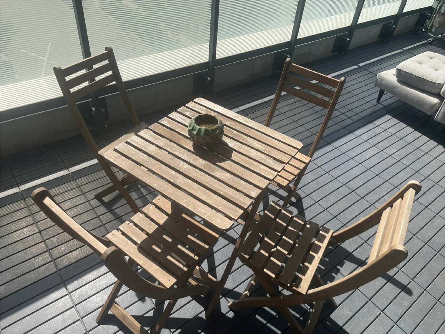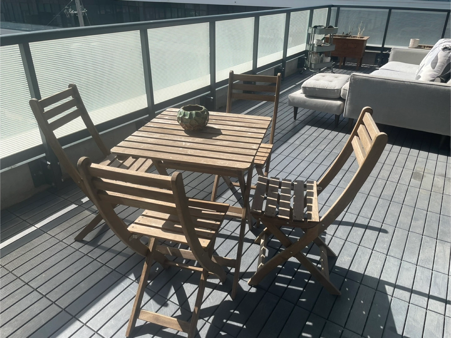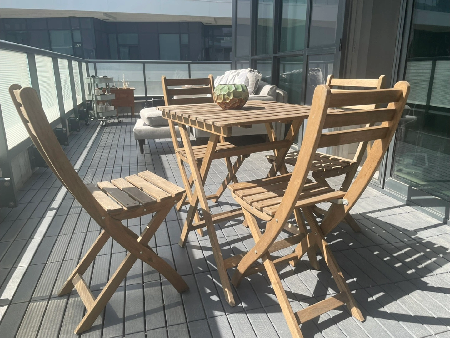 Selling a cute wooden patio set, perfect for enjoying the outdoors! Includes a square table and four matching chairs. It's in good condition and ready for your balcony or patio