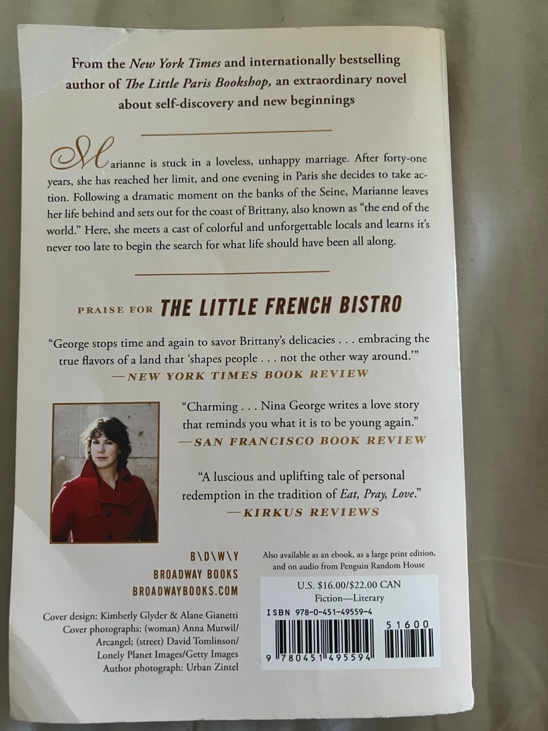 Selling "The Little French Bistro" by Nina George! It's a novel about self-discovery and new beginnings, following Marianne as she leaves her unhappy marriage and starts a new life in Brittany. Originally bought for $11.99, this book offers a charming love story that reminds you what it is to be young again