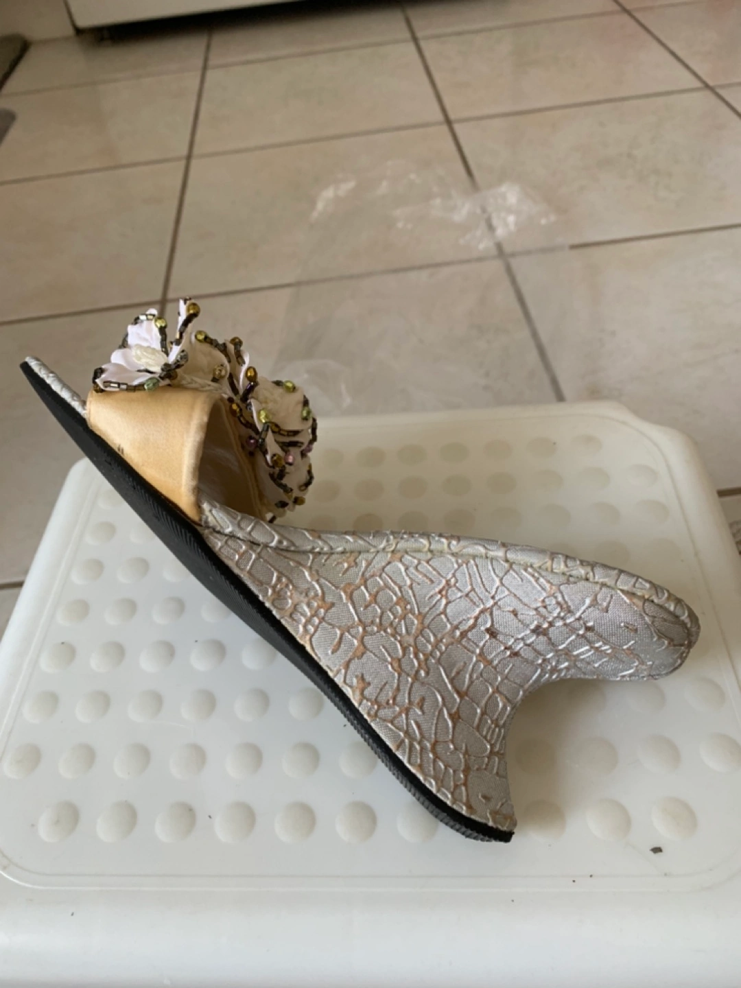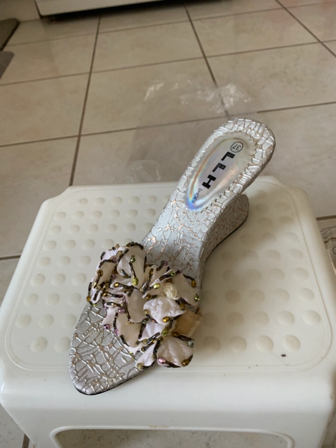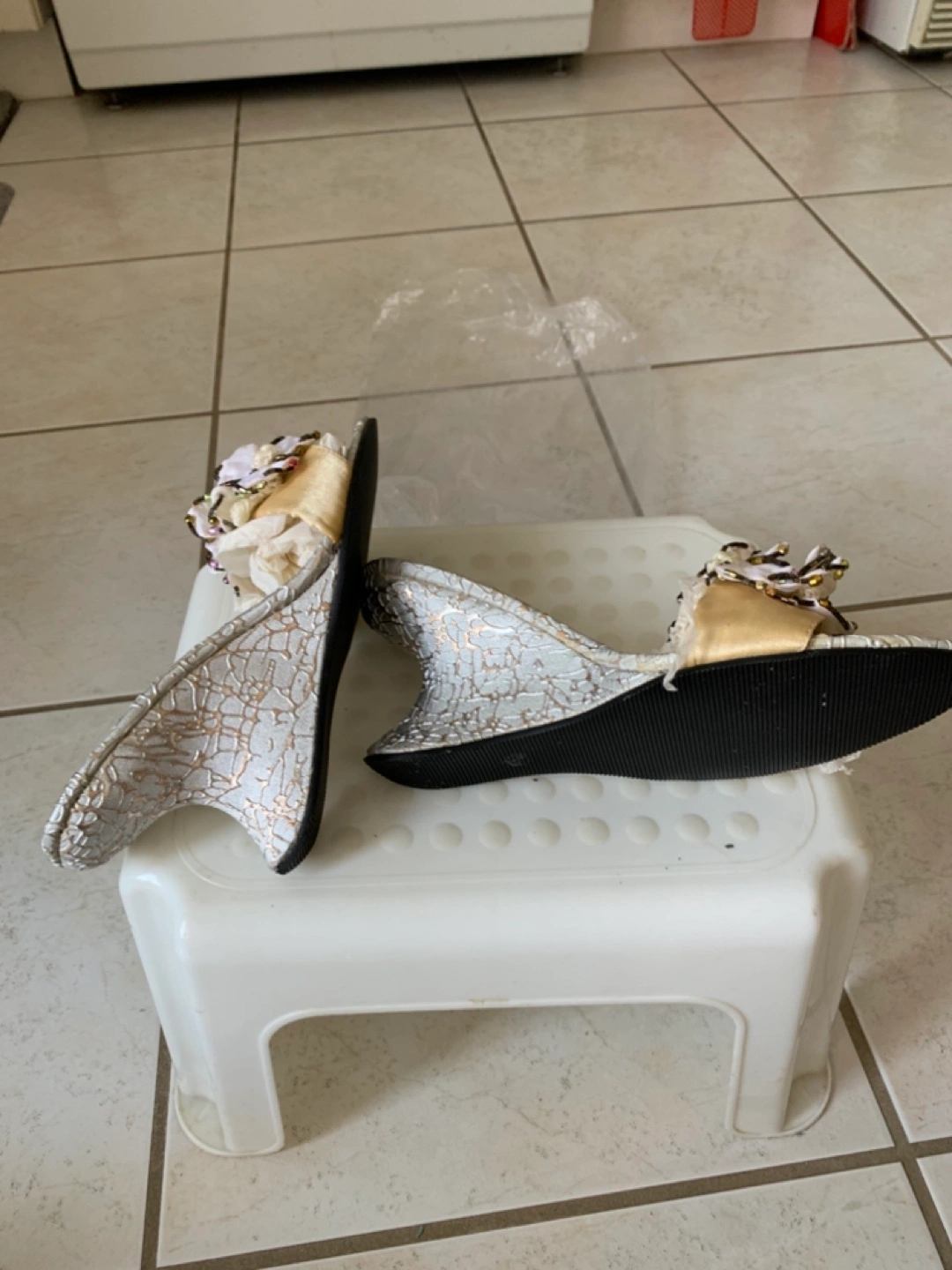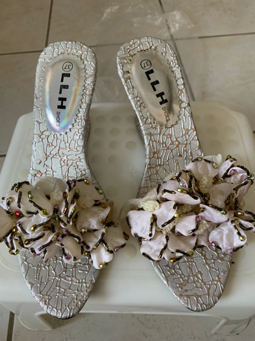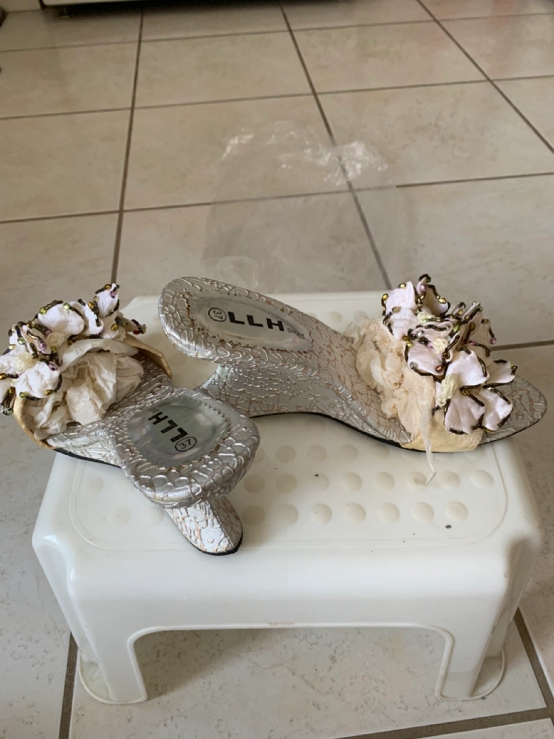These are a pair of silver sandals from LLH! They are a size 37 and have a cute slight gold trim floral design on the front Heel size: approx. 3-1/2”