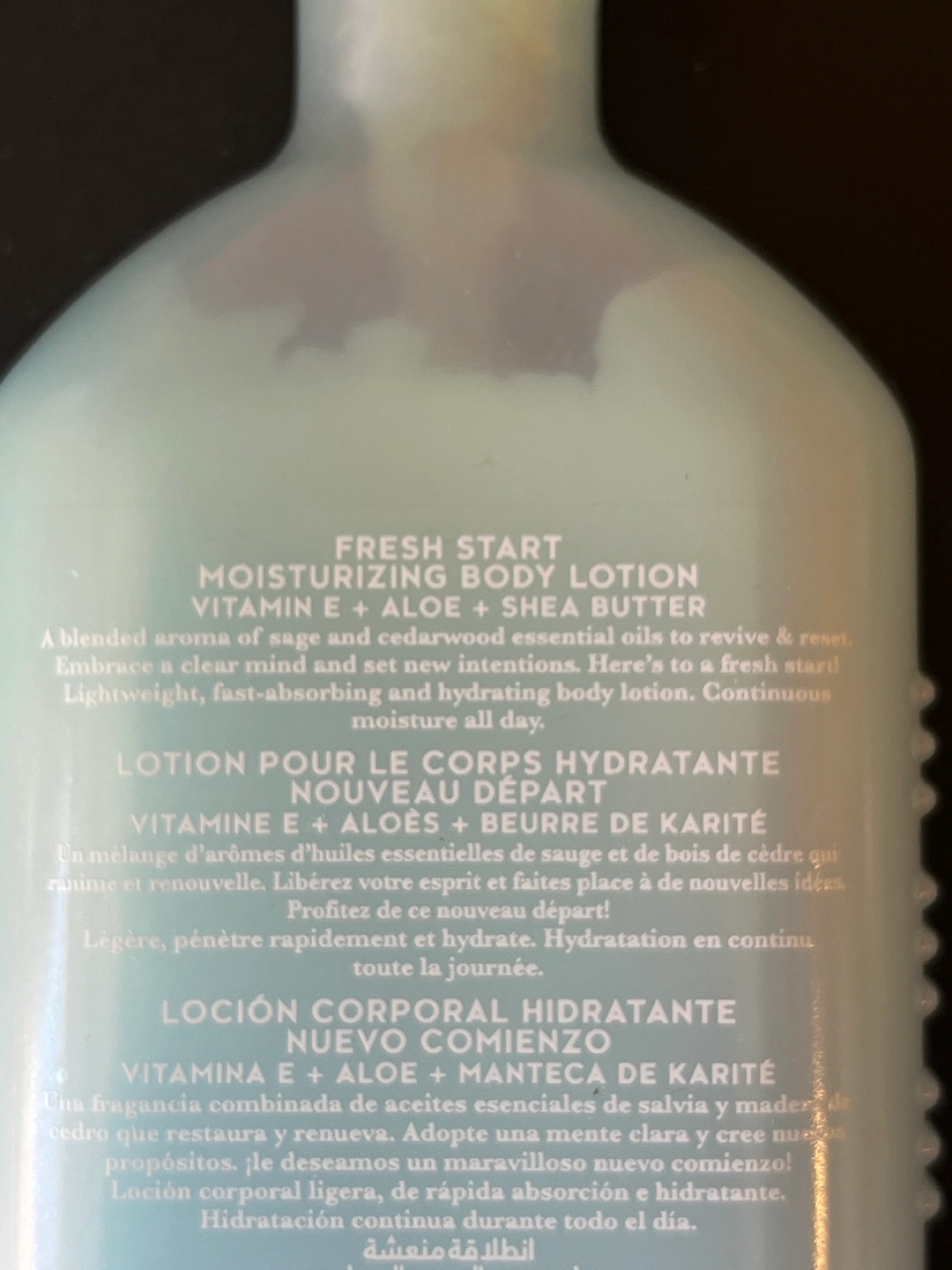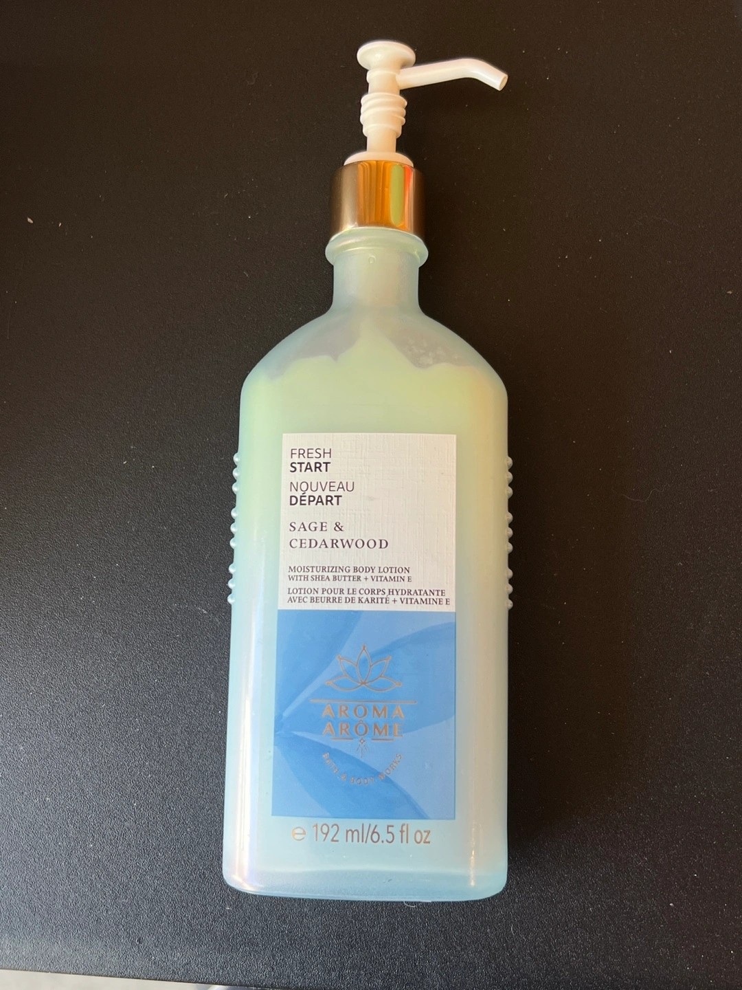 Selling a bottle of Aroma Arome Sage & Cedarwood moisturizing body lotion. It contains Vitamin E, Aloe, and Shea Butter. It's a lightweight, fast-absorbing, and hydrating lotion. The bottle contains 192 ml / 6.5 fl oz