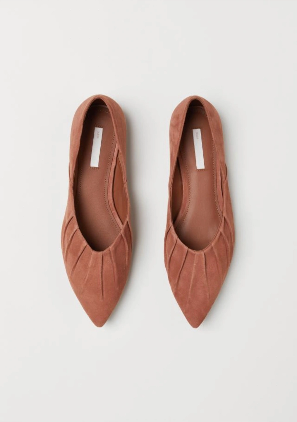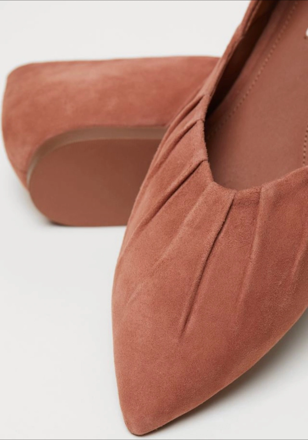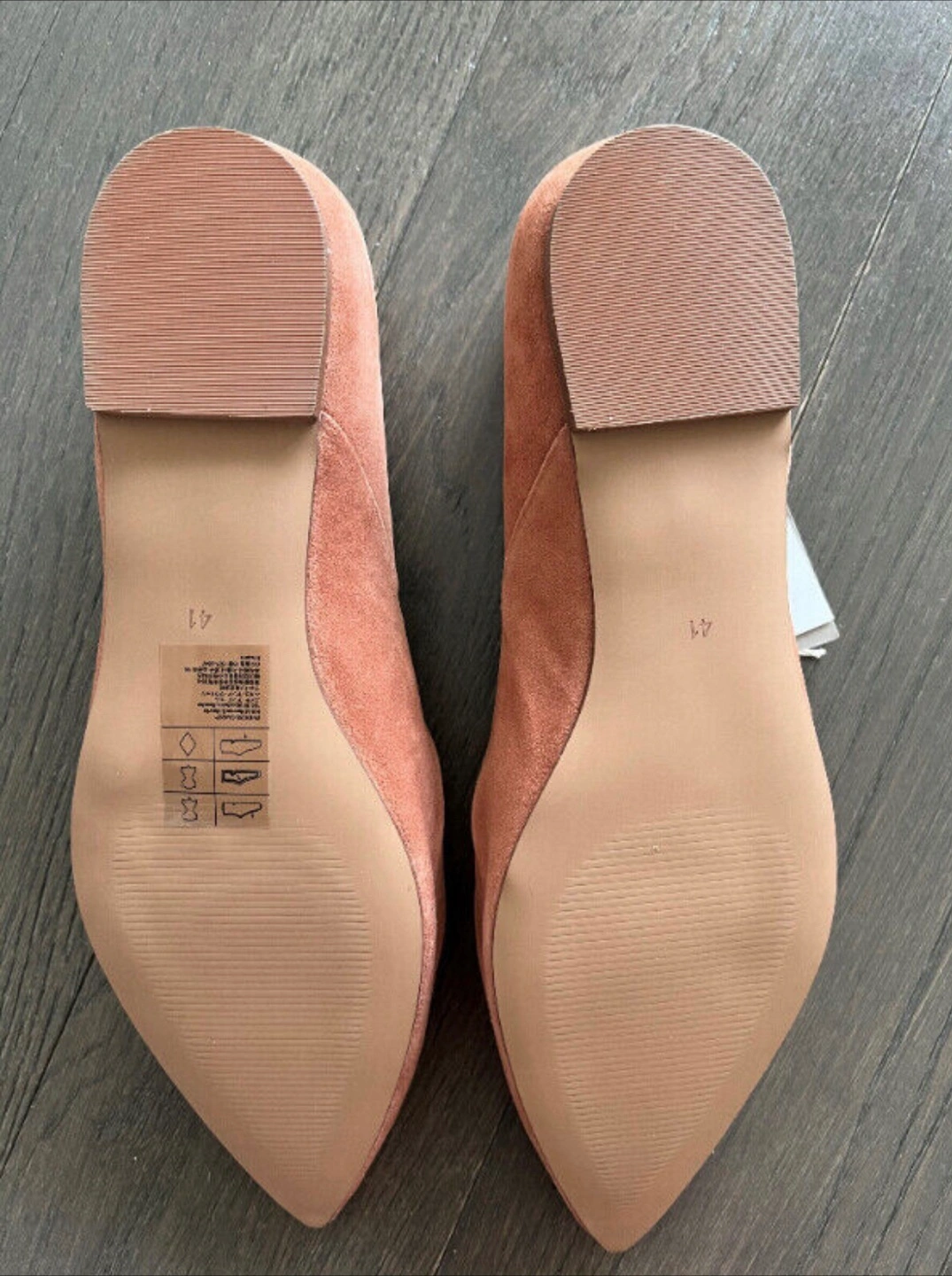 Brand new flats in genuine suede with pointed toes and pleats at front, size 9.5. Leather lining, leather insoles.
