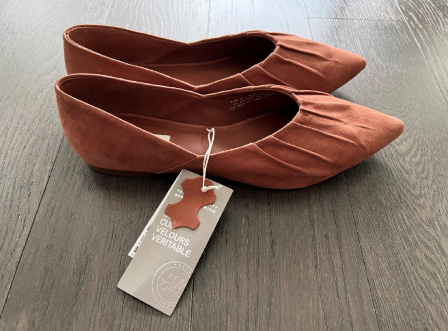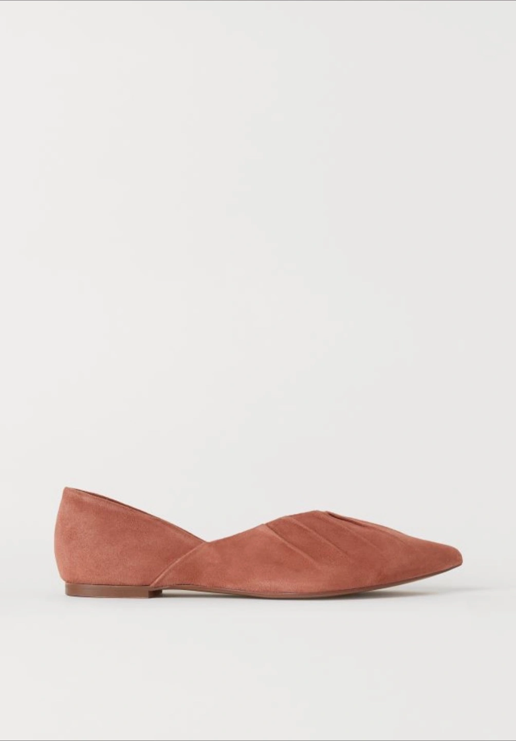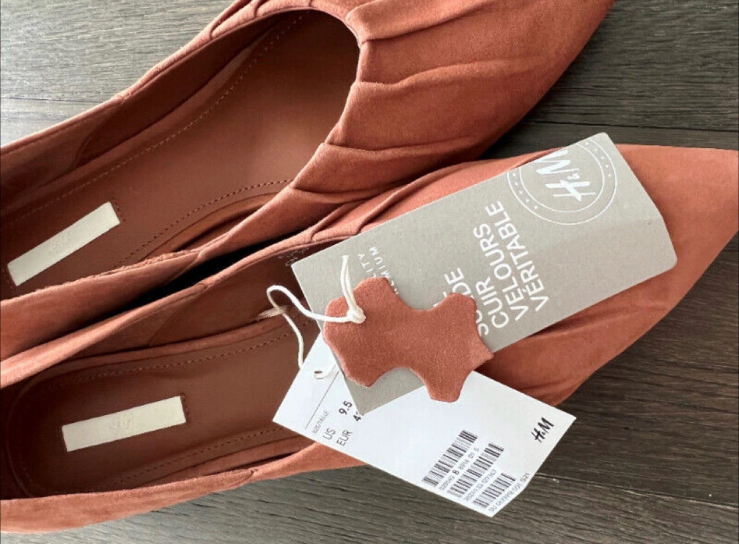 Brand new flats in genuine suede with pointed toes and pleats at front, size 9.5. Leather lining, leather insoles.