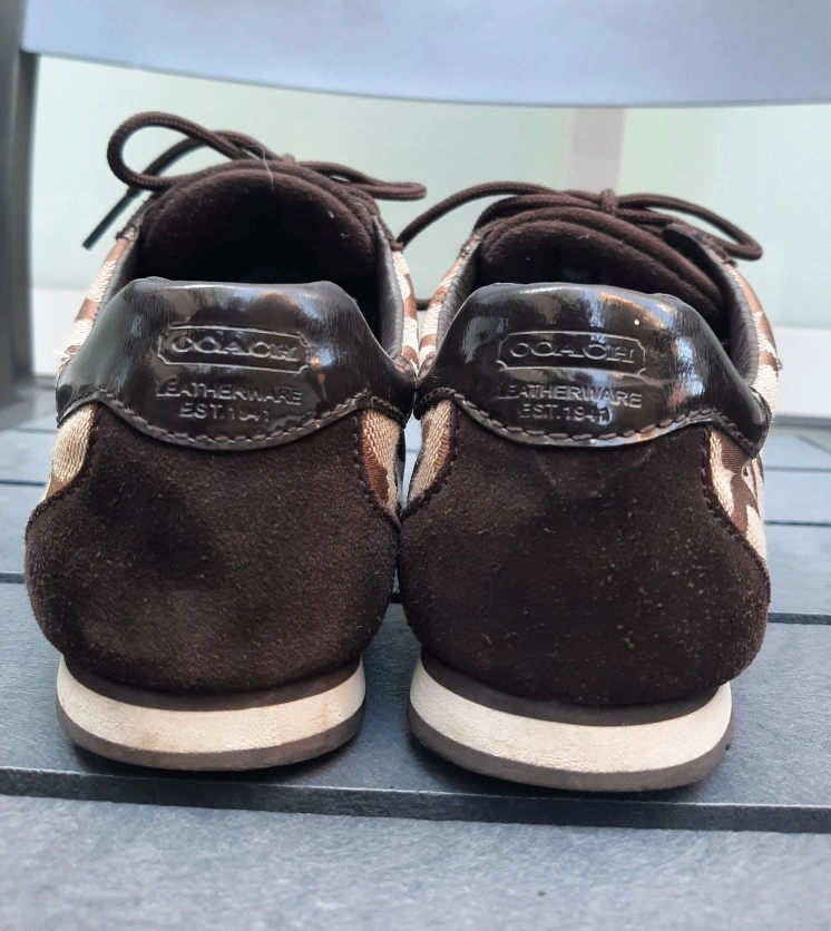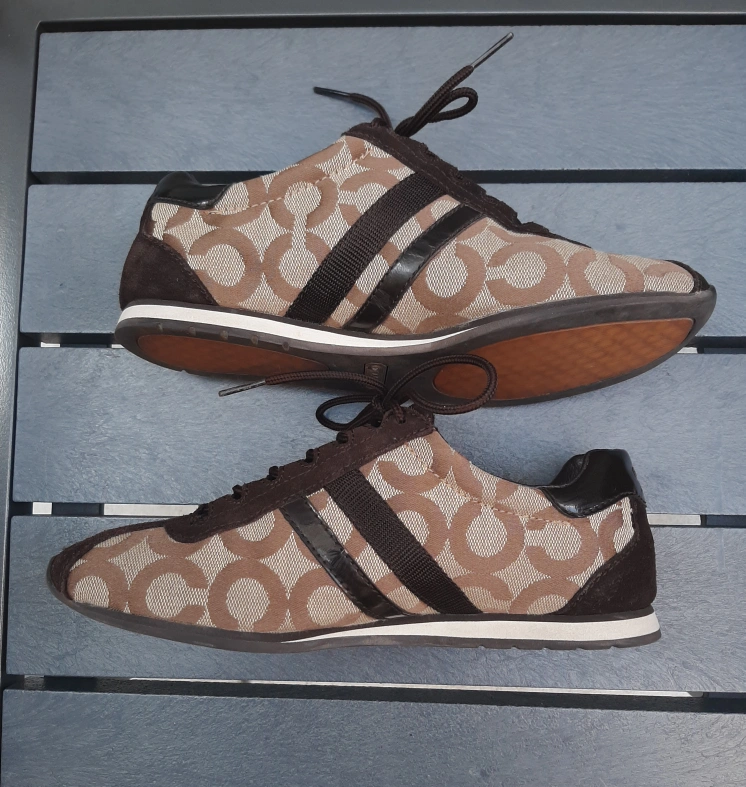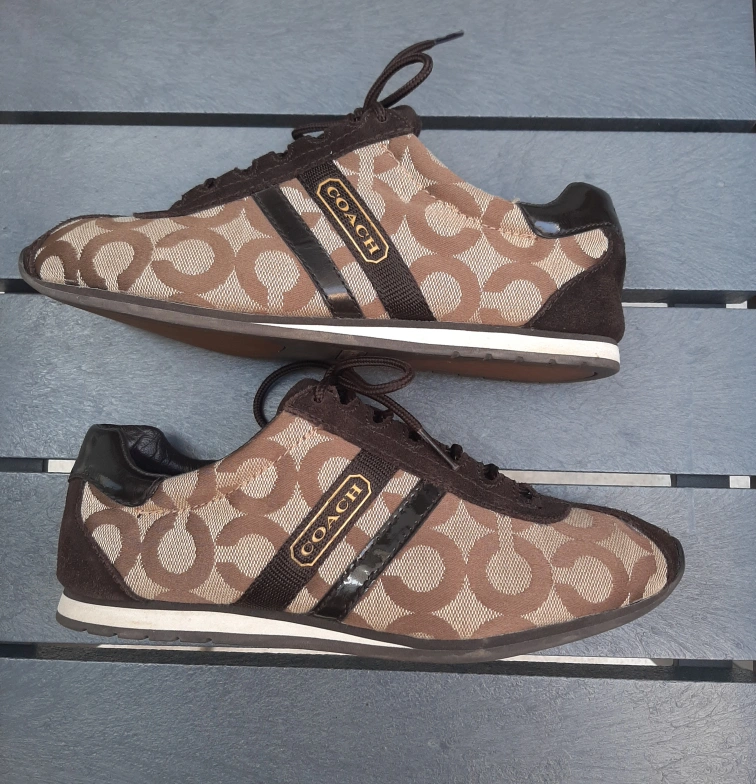 These Coach sneakers feature a stylish brown patterned design! They are in great condition and ready for a new home. Perfect for casual wear and adding a touch of elegance to your outfit