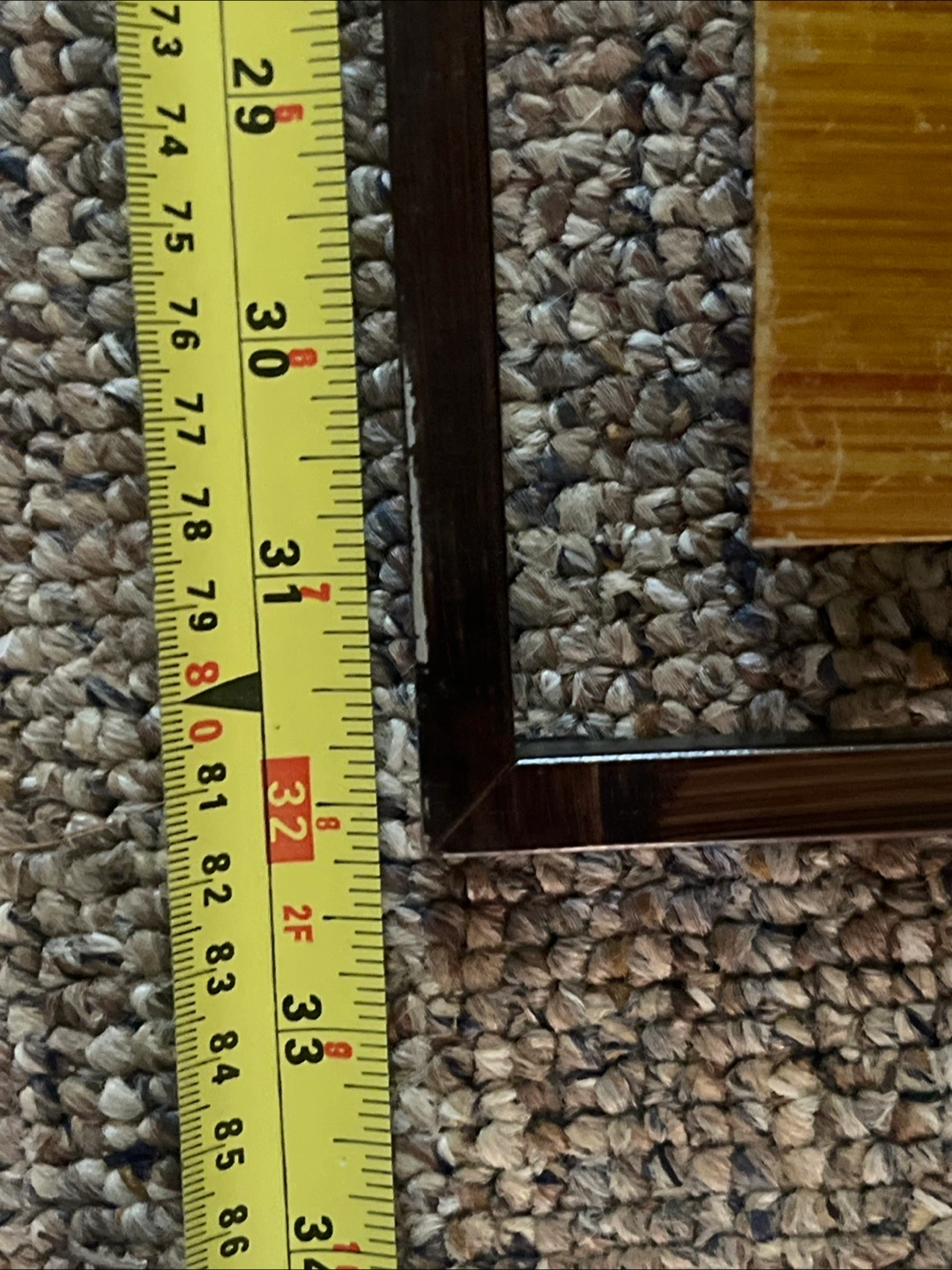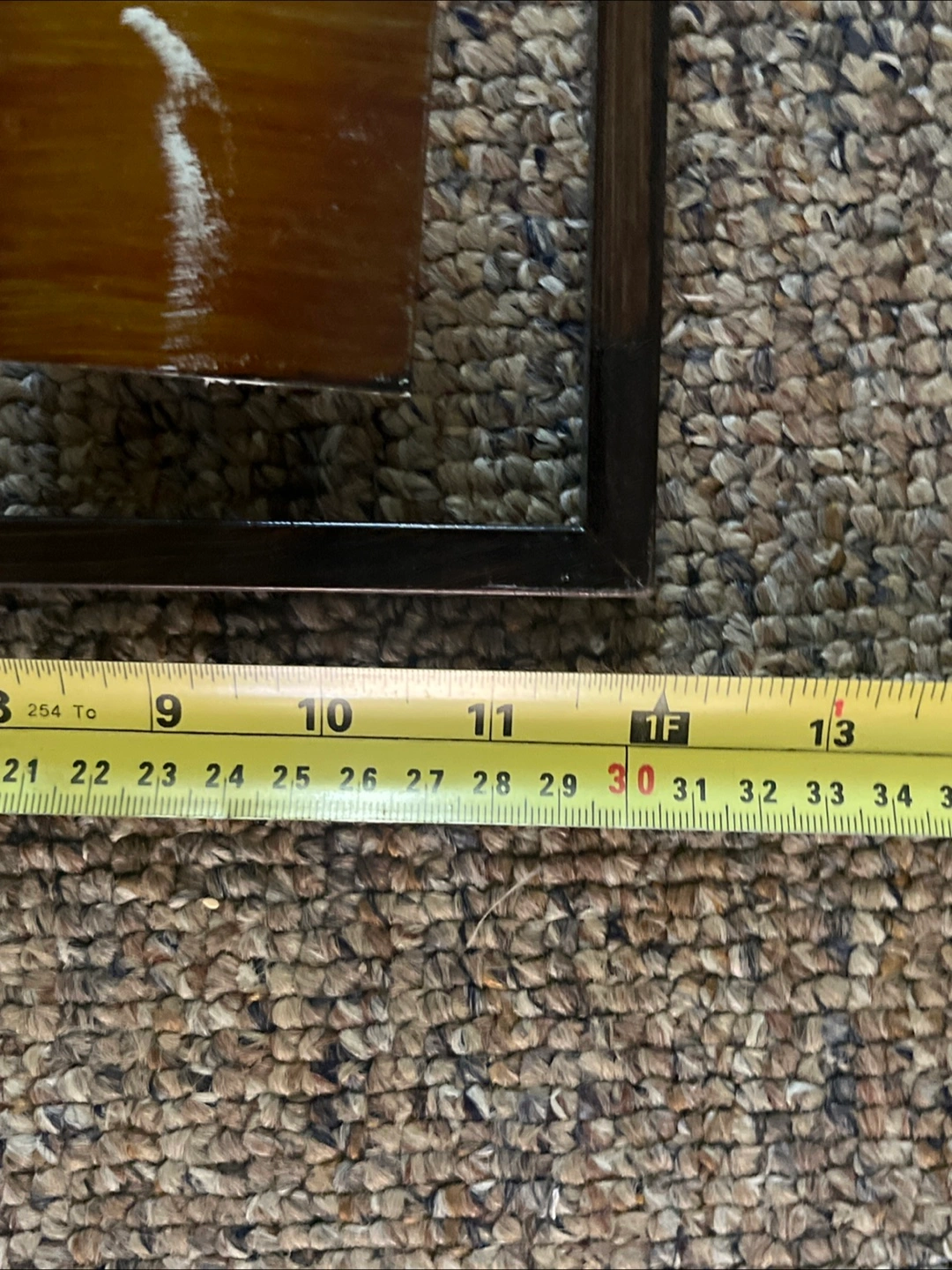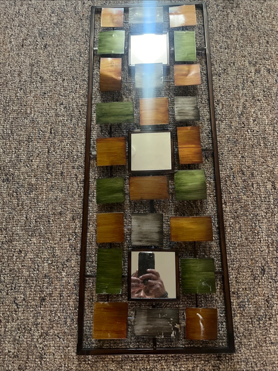 Unique wall decor featuring a metal frame with wood and mirror accents! It measures approximately 34 inches in length, adding a stylish touch to any room
