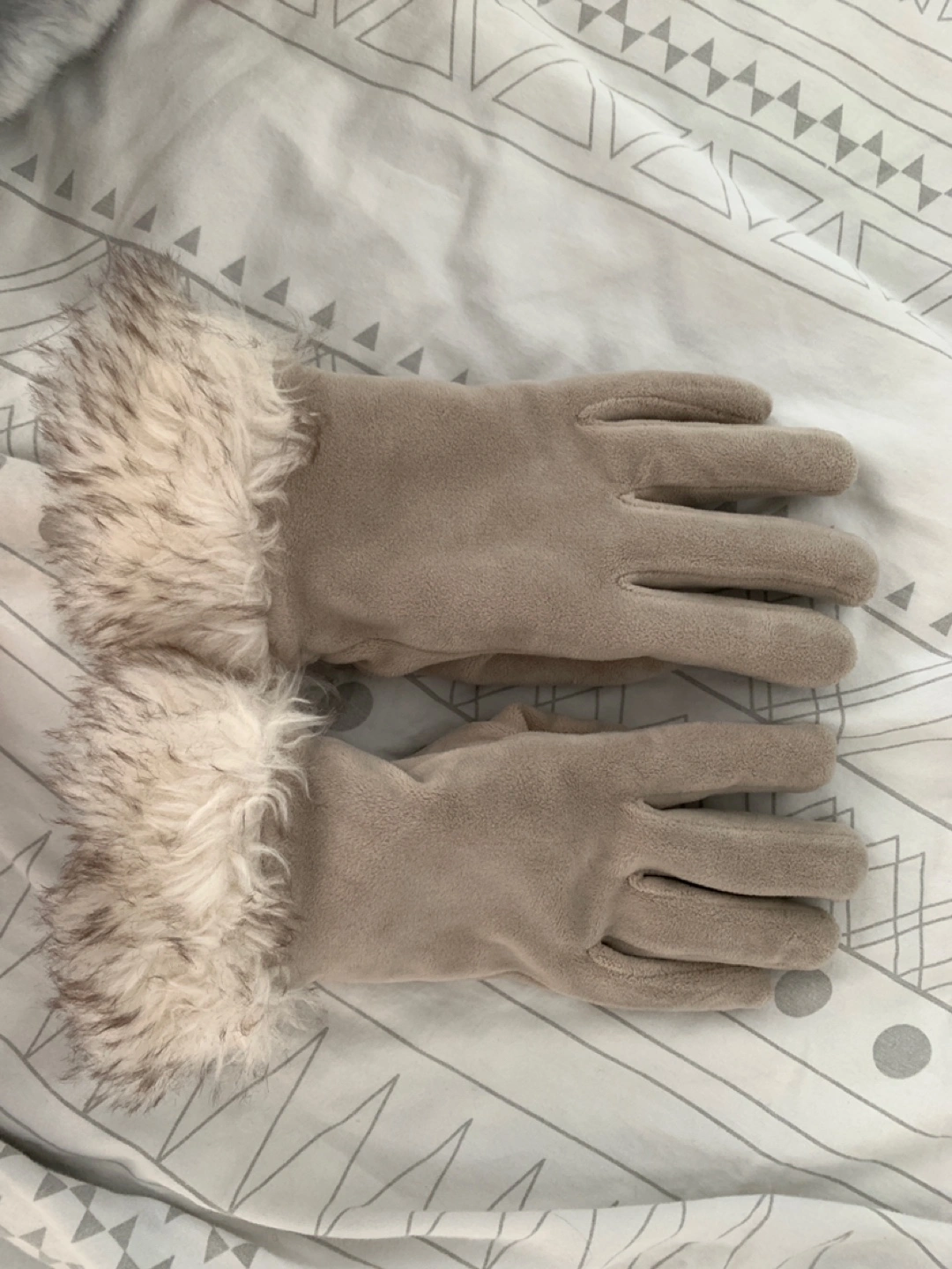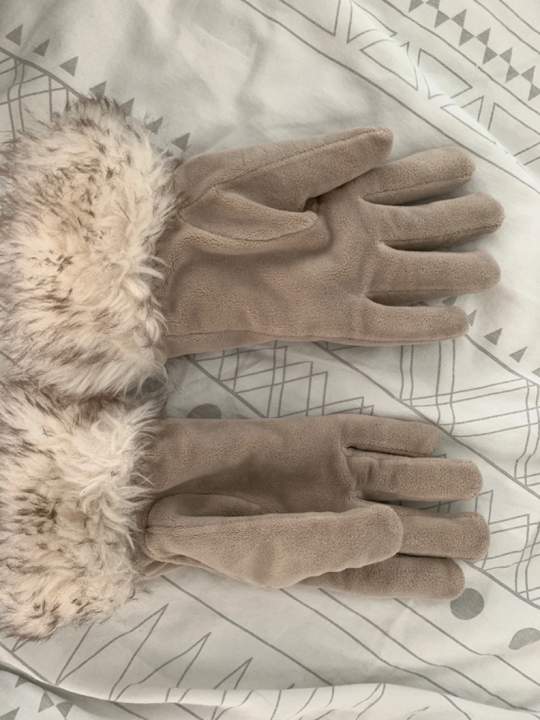 Cozy up with these stylish beige gloves, perfect for chilly days! They feature a soft, plush fur trim around the cuffs, adding a touch of elegance and extra warmth. They are a size medium and are in great condition!