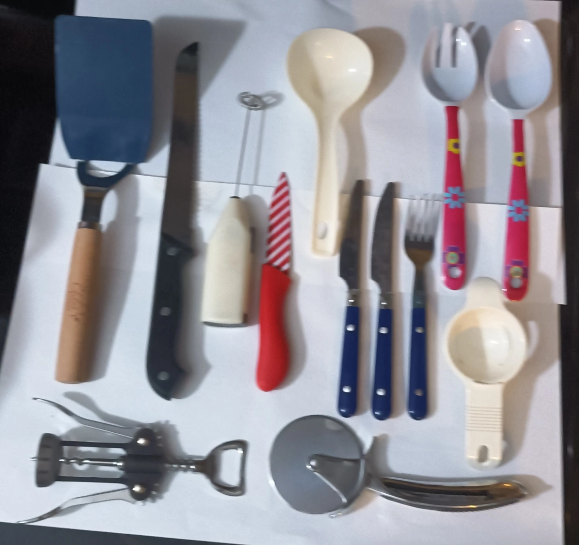 Here's a collection of kitchen utensils, perfect for anyone setting up a new kitchen or looking to add to their existing collection! Included are knives, a pizza cutter, a corkscrew and more!
