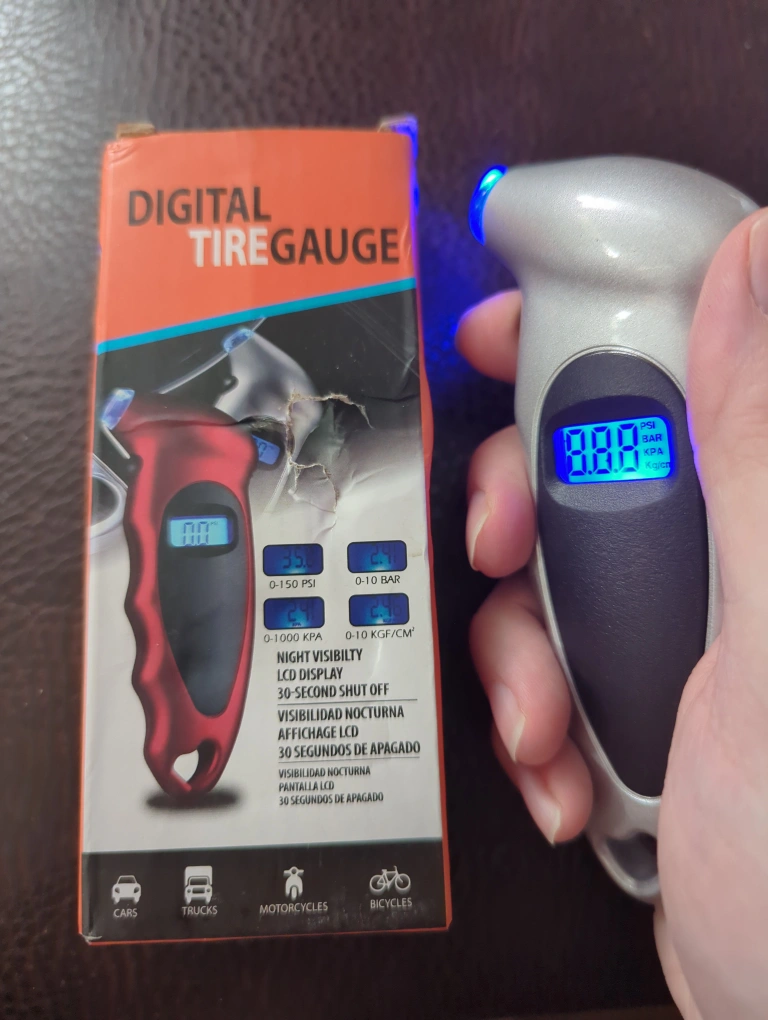 Selling a like new digital tire gauge! It's suitable for cars, trucks, and bicycles. The instructions are printed right on the box for easy use. It measures in PSI, Bar, Kgf/cm², and Kpa. Ensure your tires are always properly inflated!