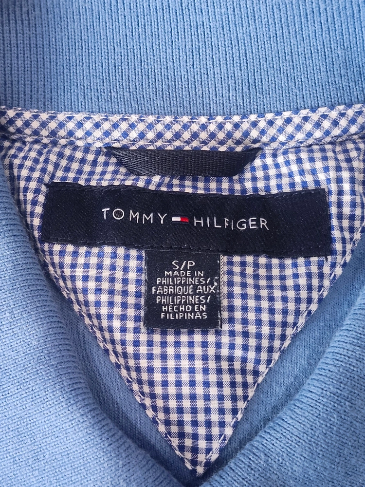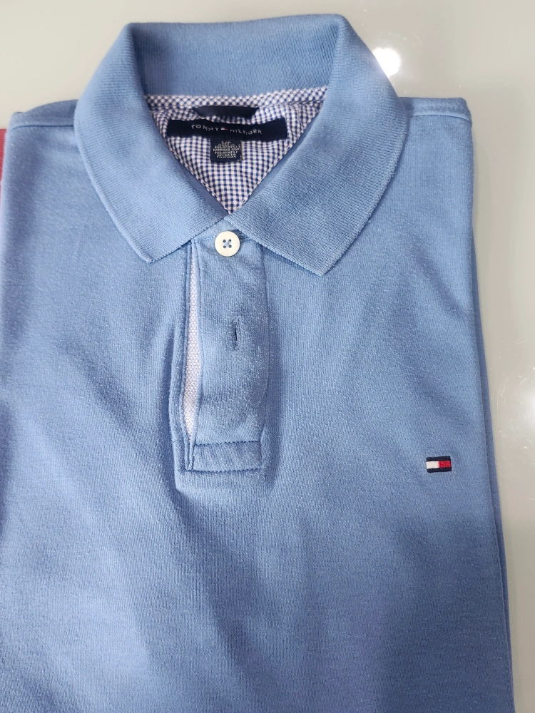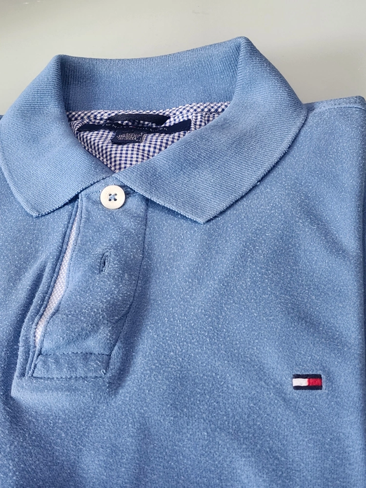 Tommy Hilfiger polo shirt in size small! It's a light blue colour and in great condition. Perfect for a casual day out or dressing up a bit.