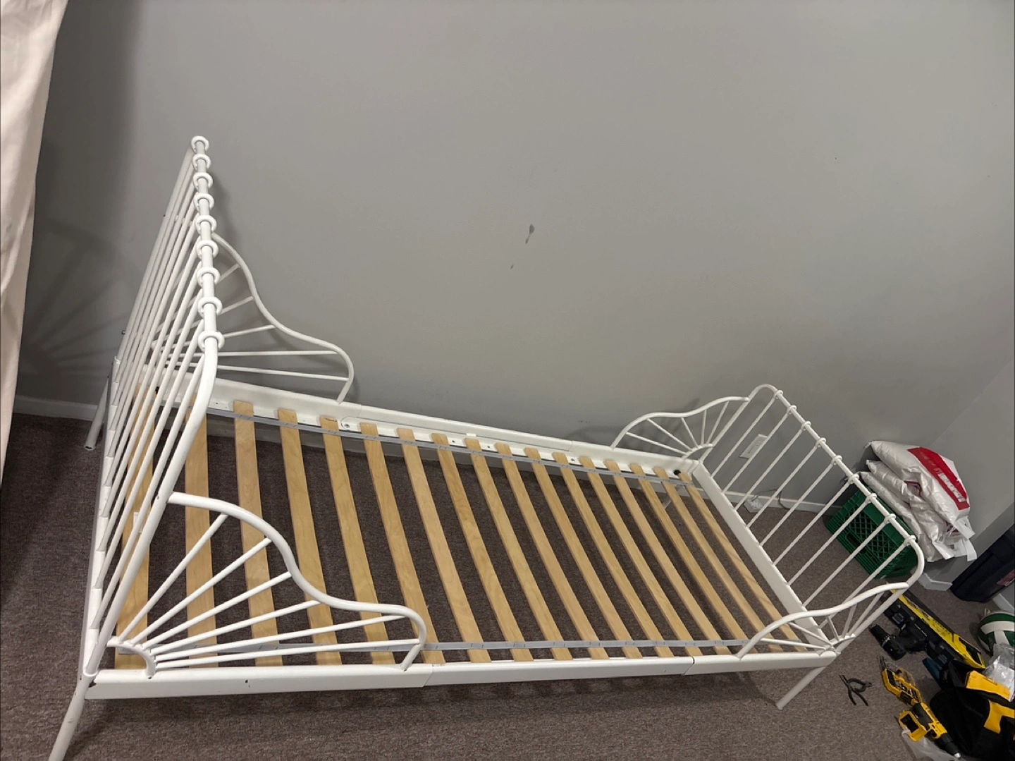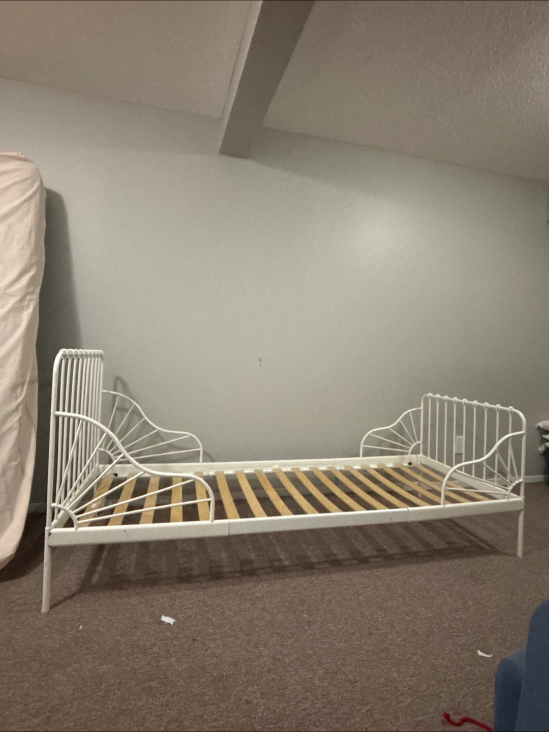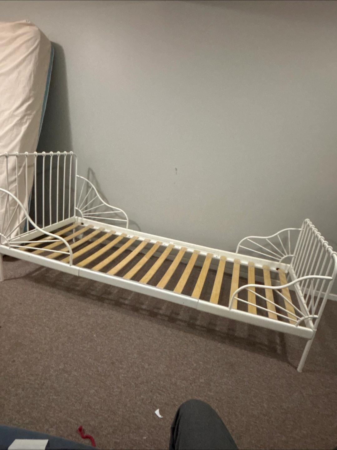 Selling a white IKEA Minnen extendable bed frame. It's in good condition and perfect for a growing child. The bed frame is designed to adjust as your child grows, making it a practical and stylish choice for any kids' room!