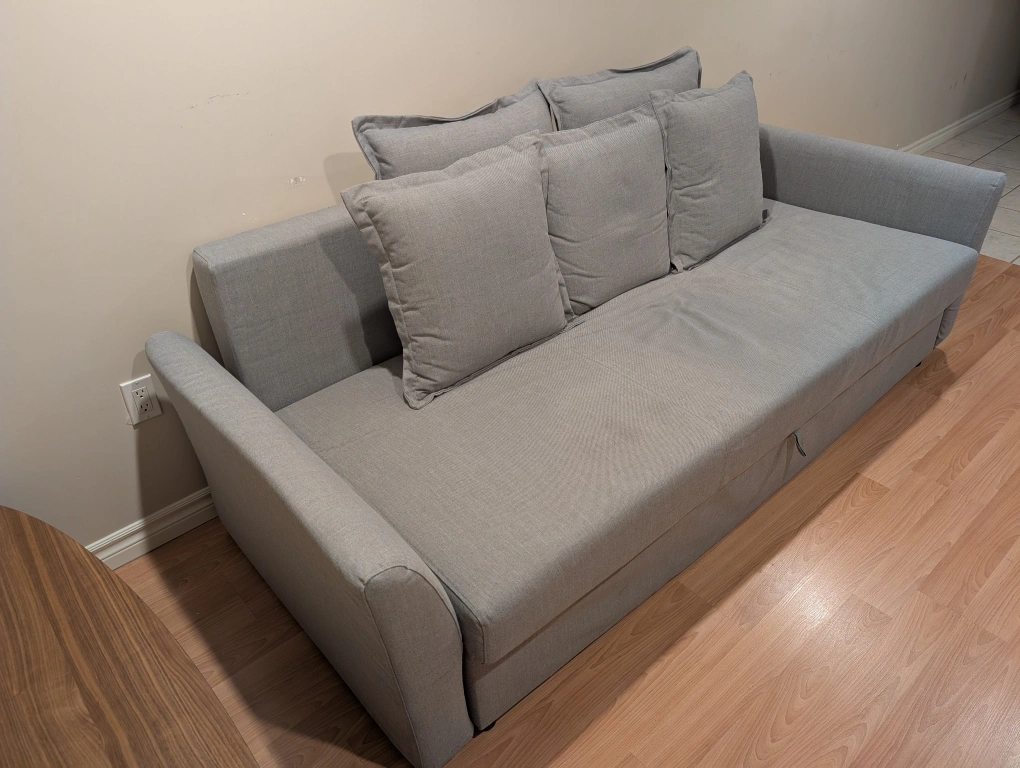 Holmsund IKEA sofa bed in a grey colour. It's in great shape and perfect for guests or small spaces. It easily converts into a queen-sized bed and has a convenient storage compartment underneath for blankets or pillows. The cover is removable and washable. Assembly instructions and five cushions included. Retail price is $1499, getting rid of it because I'm moving. You pick up, but I can help you disassemble and load it if necessary.