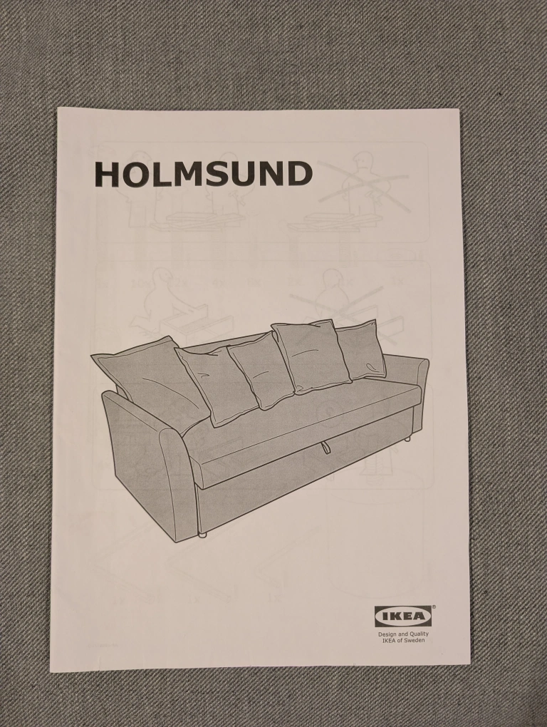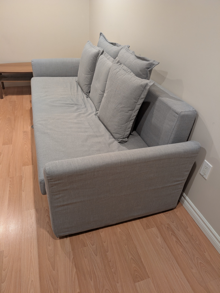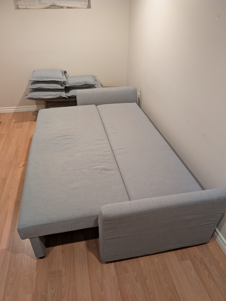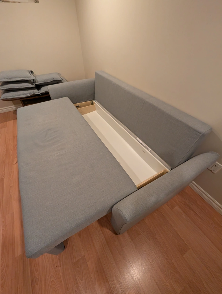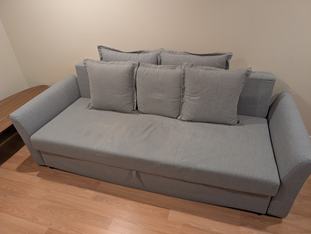 Holmsund IKEA sofa bed in a grey colour. It's in great shape and perfect for guests or small spaces. It easily converts into a queen-sized bed and has a convenient storage compartment underneath for blankets or pillows. The cover is removable and washable. Assembly instructions and five cushions included. Retail price is $1499, getting rid of it because I'm moving. You pick up, but I can help you disassemble and load it if necessary.