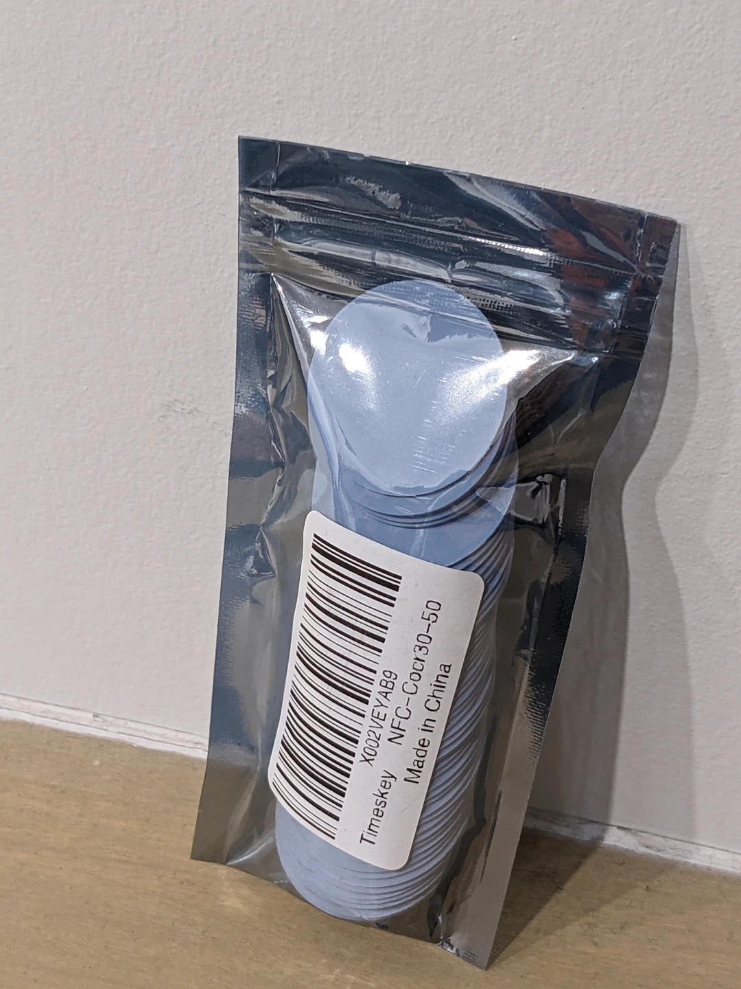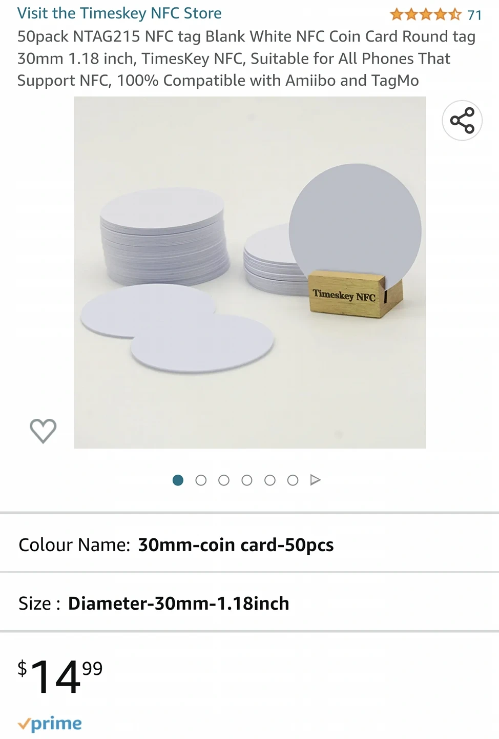50 NTAG215 NFC tags. These can be written to with an android device in order to emulate amiibo or other NFC devices.