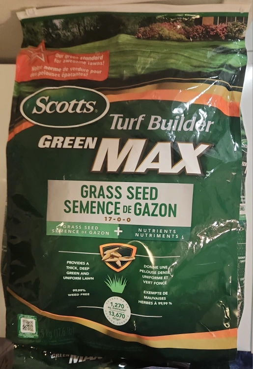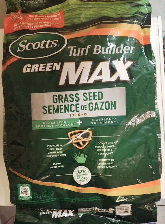 Selling a bag of Scotts Turf Builder Green Max Grass Seed. It's an 8 kg (17.6 lb) bag, perfect for getting that thick, deep green, and uniform lawn you've always wanted! It's also 99.99% weed-free, so you can be sure you're only growing grass