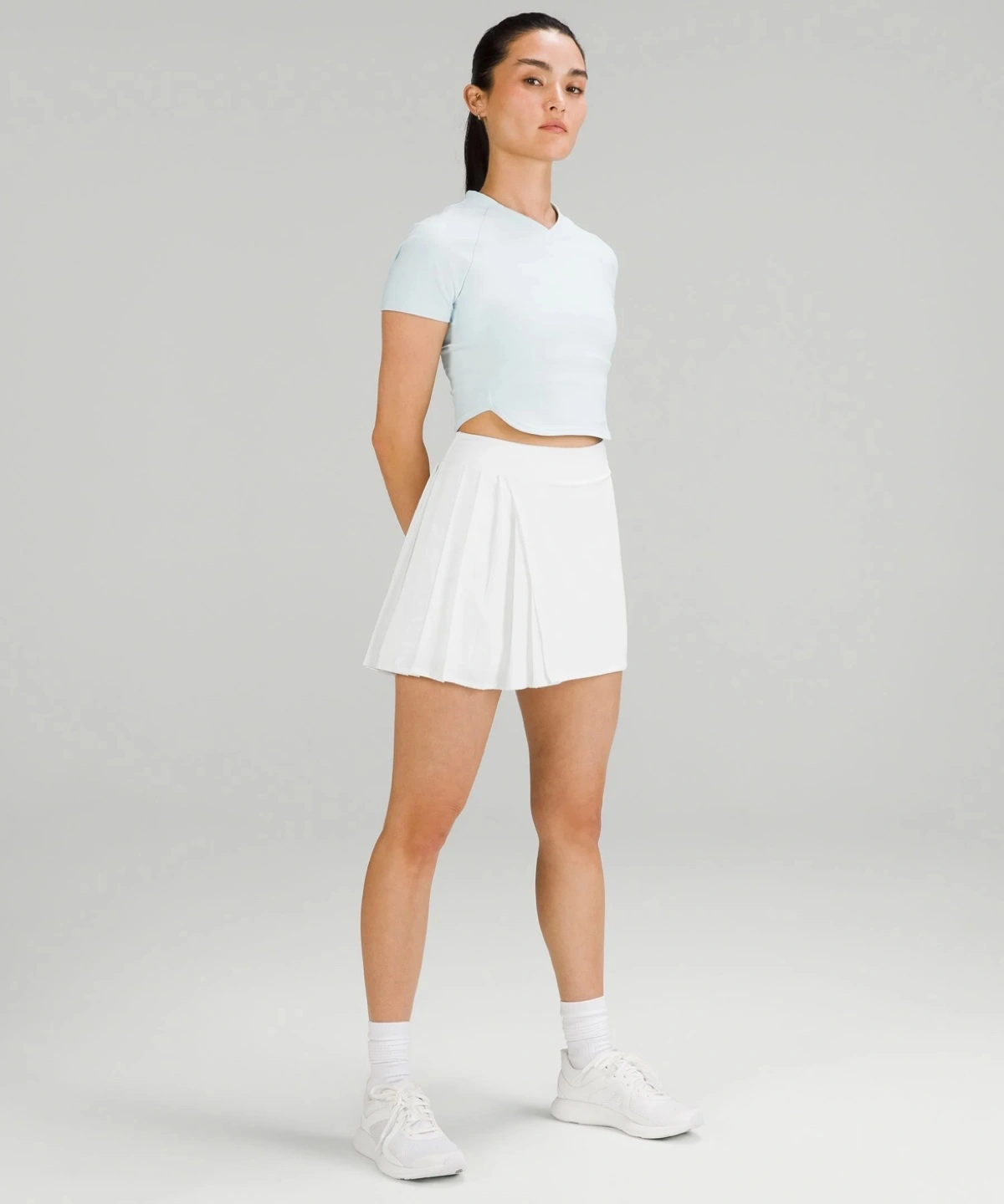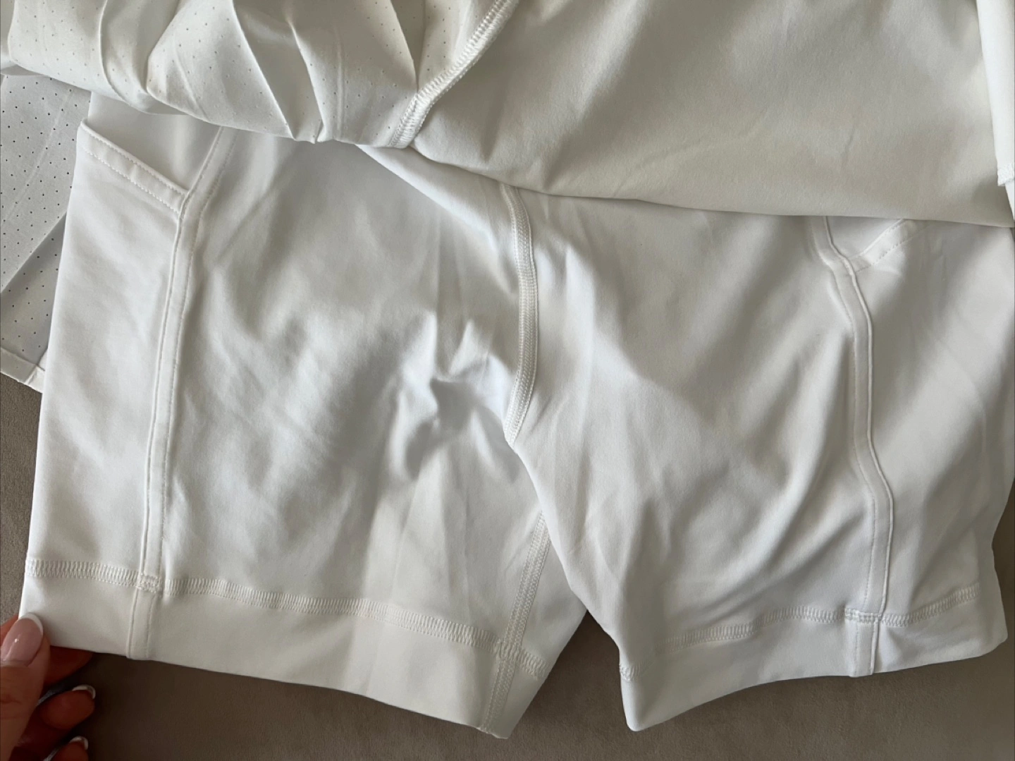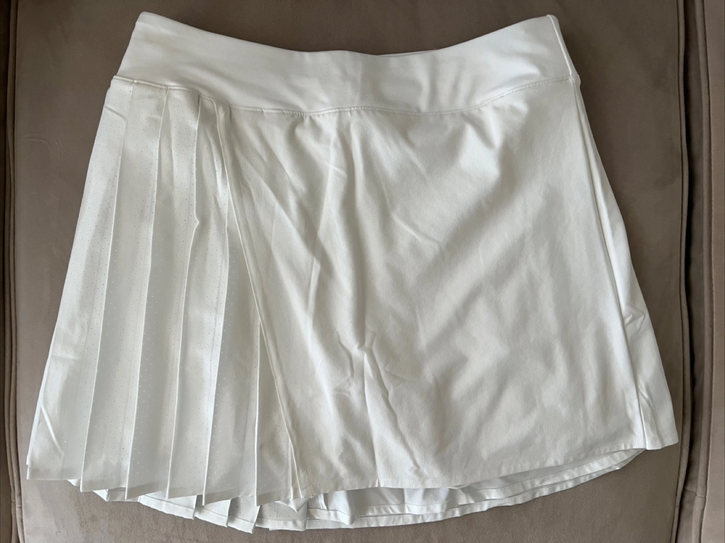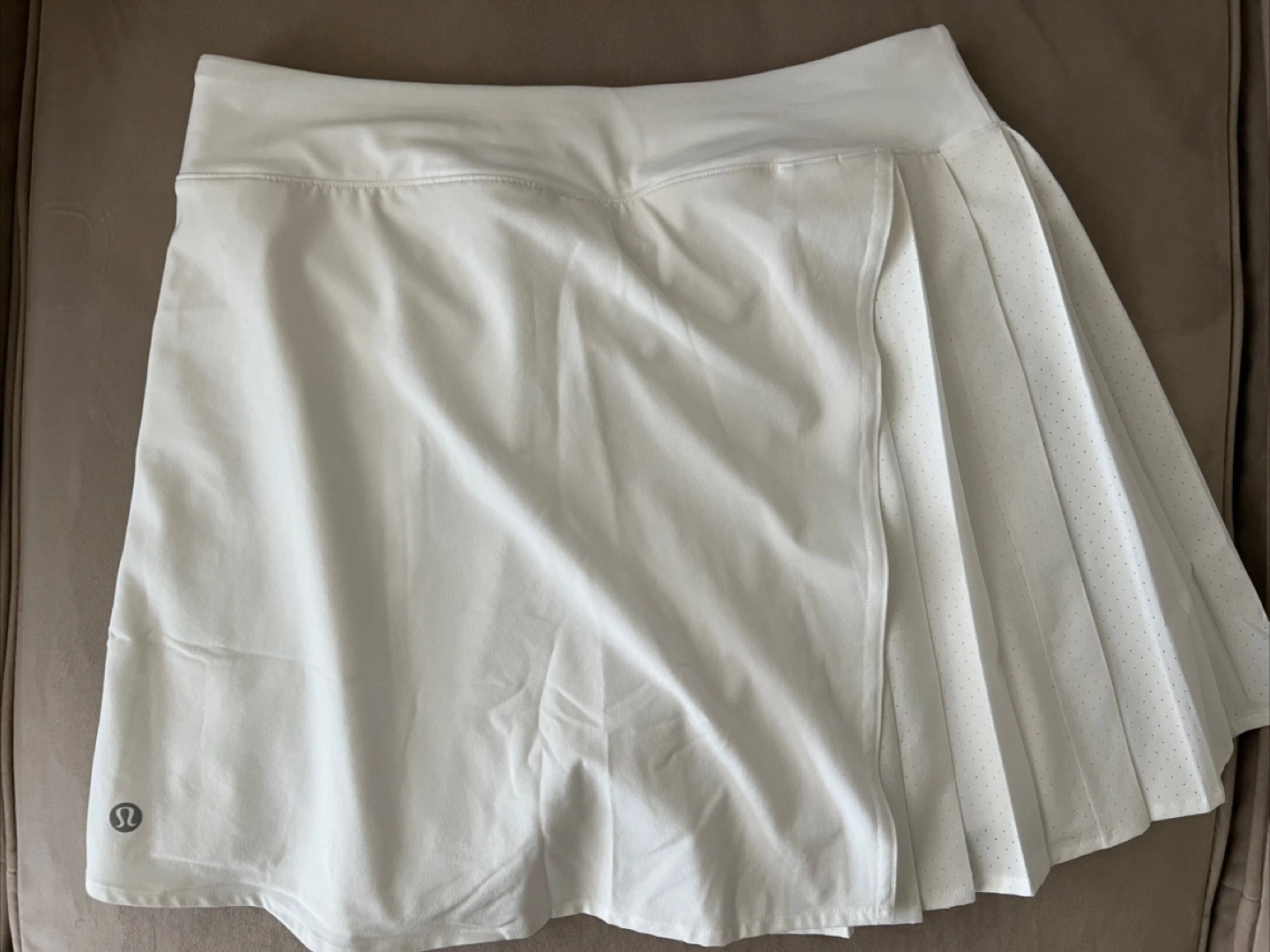 Selling a new never worn (tags off) Lululemon tennis skirt in white, with asymmetrical pleats.